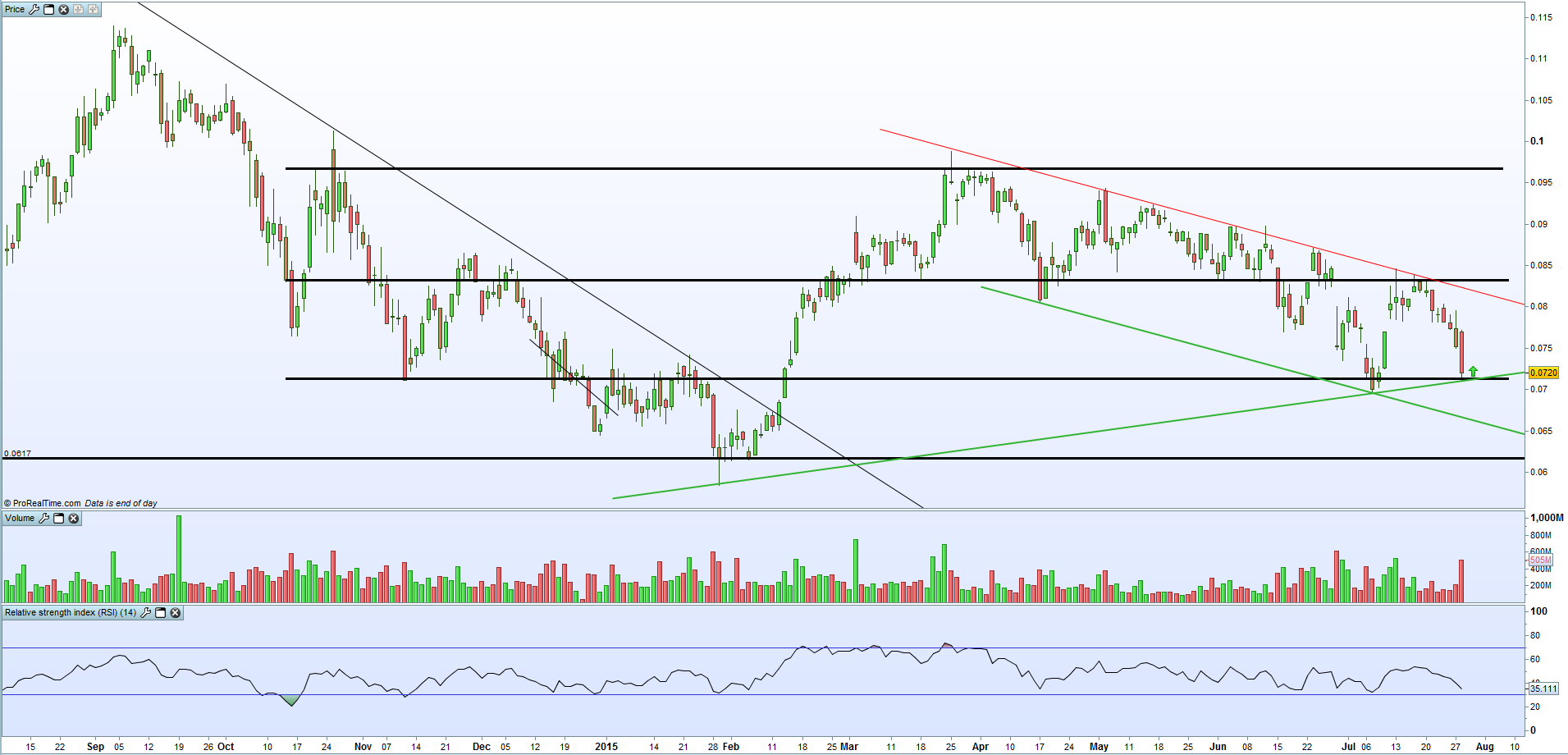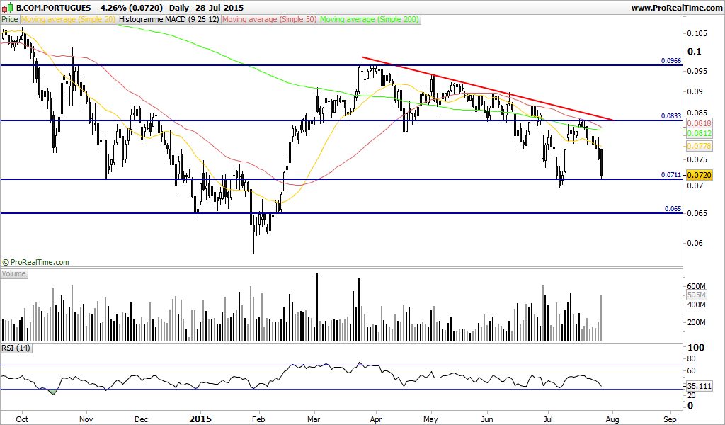 Julho foi um mês de muita turbulência (ainda o está a ser) onde Grécia, China, Angola para a cotada em questão, tiveram muito peso. Quebrou a MM50 e pode bem espreitar o suporte abaixo 0.68. Aí será muito mau, pois uma cotada que está durante três meses a lateralizar e de repente tem uma queda abrupta no mes de 15 a 20% dá que pensar.