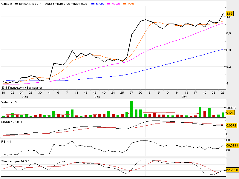 Continuam os "picos" na Brisa em que a cotação sobe em flecha...hoje chegou aos 8.90 e voltou para os valores em torno dos 8.83. Embora os indicadores técnicos continuem a dar boas indicações, o volume hoje não foi elevado e fechou a meio do range da sessão. Será que é amanhã que fecha acima dos 8.85(valor histórico mais alto em fecho)? Será importante que nos próximos dias isso aconteça e claro de preferência com um volume elevado.