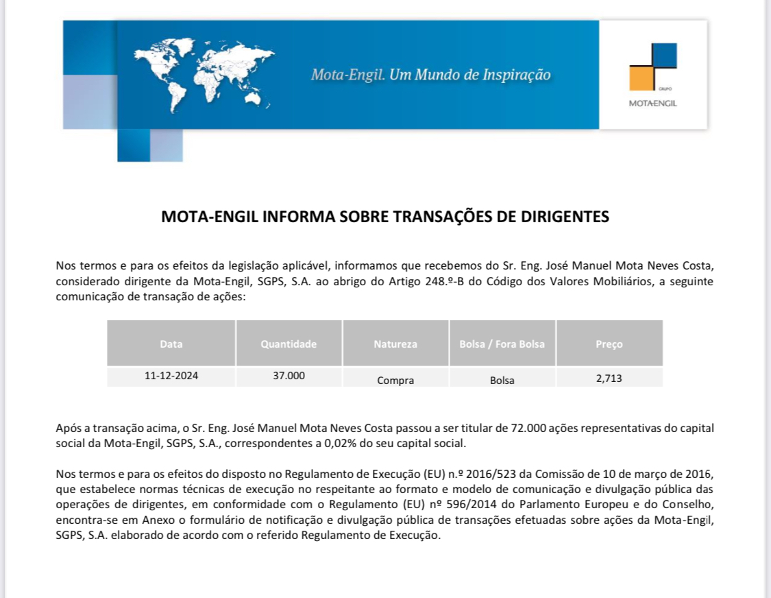 MOTA-ENGIL INFORMA SOBRE TRANSAÇÕES DE DIRIGENTES