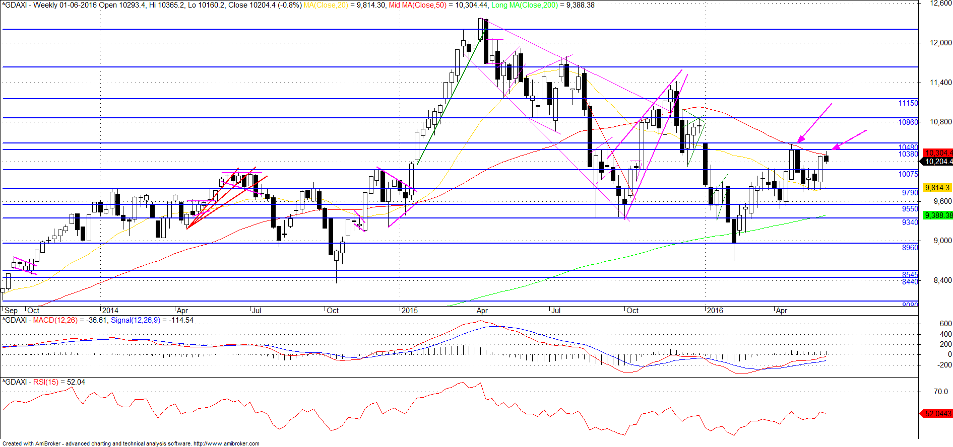 No DAX a MM200 semanal neste momento nos 10319 deverá servir de barreira a subidas superiores, tal como aconteceu em meados de Abril nas 2 semanas de forte subida .