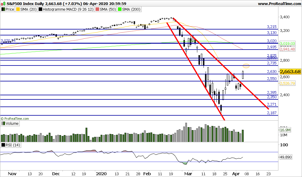 Abertura nos 2740, agora nos 2751 (acima da RF1 nos 2711, por confirmar em fecho). À semelhança de outros índices Mundiais, este rebound baseou-se no estado oversold e overshorted da maioria das componentes B.E.A.C.H+OIL (setores que sofreram mais com o Covid impacto), e no rápido fecho de posições curtas sobre os mesmos (que originou o aumento de volume), aliada a uma alteração de expetativas sobre o timing Trumpiano do plateaux do corona e sobre o real impacto Macro da mega recessão.