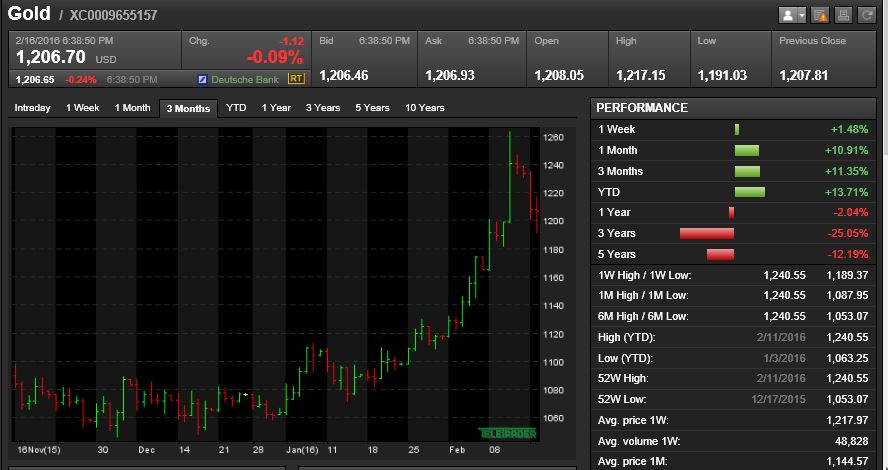 O metal precioso está a recuperar da pior sessão em quase sete meses, com os investidores a voltarem a privilegiar investimentos mais seguros em detrimento dos activos de risco. O ouro avança 0,5% para 1.215,60 dólares por onça. O metal continua a ser o melhor investimento em 2016, ao valorizar 15%, a beneficiar do seu estatuto de refúgio face ao clima de instabilidade nos mercados financeiros.