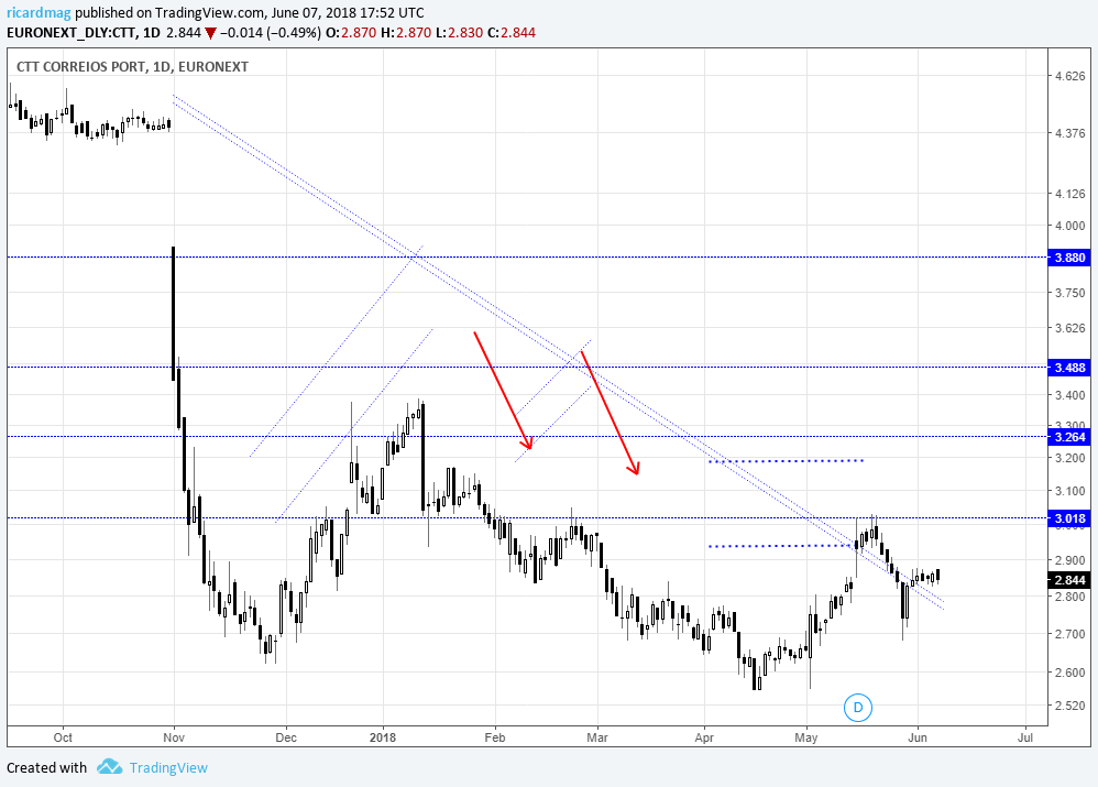 A bolsa sobe há 7 sessões e os Ctt's estão em banho Maria a guardar que corrija para apanharem boleia. Um claro sinal de que os ursos continua a dominar. Temos então 2.81 para segurar e 2.87 para cair.