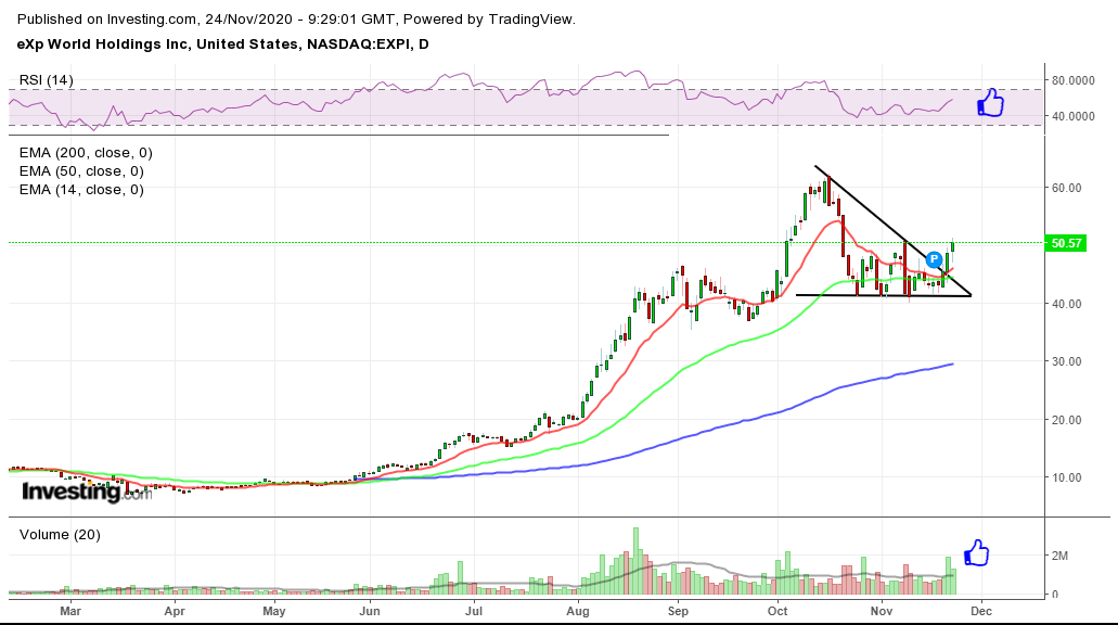 Quebra em alta do triângulo, com aumento de volume e RSI longe to overbought.
