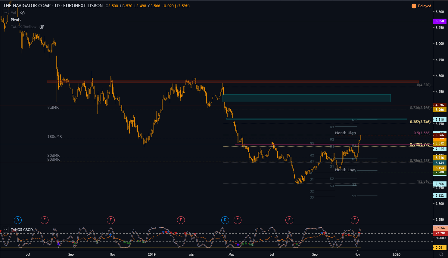 Em minha opinião, como já está acima da MM200 diária, se amanhã fechar a semana em alta, talvez se assista ao início da reversão de tendência bearish... abriam-se as portas aos touros, ao ultrapassar os 3,75€, rumo a voos mais altos...