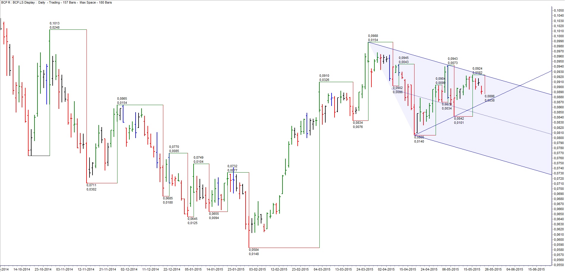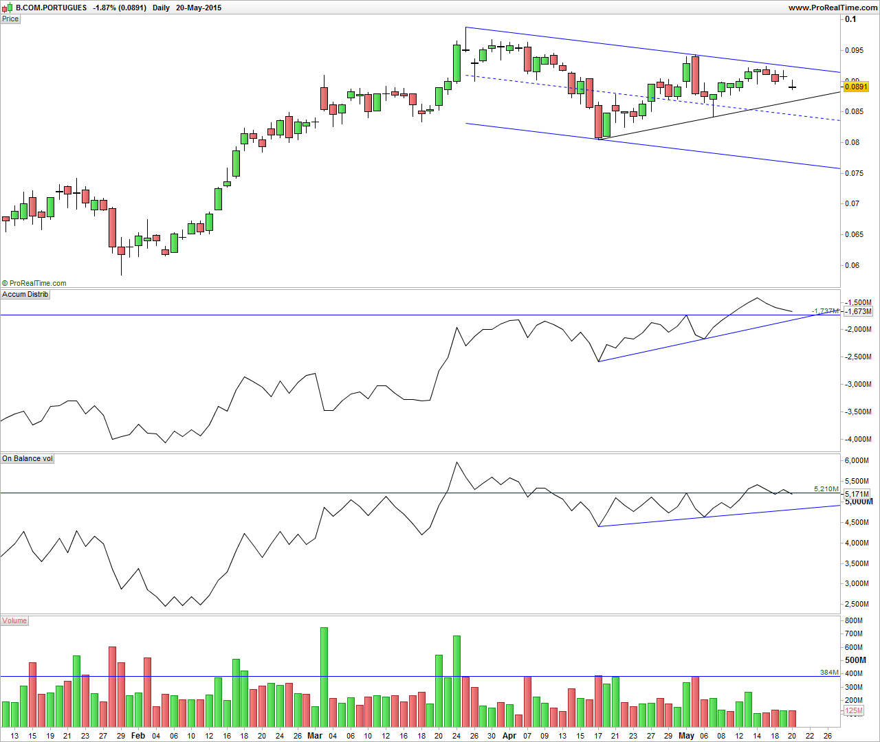 «Depois de uma re-análise ao título, vê-se agora uma nova cara técnica no BCP. Aparentemente estão afastadas as nuvens negras e os sinais apontam já para novas subidas. Hoje, a resposta que o BCE poderá trazer amanhã já se fez sentir a meio do dia de forma mais clara. As quedas que se registavam em algumas das principais praças europeias inverteram para valorizações significativas no final do dia. Estou convicto de que o programa trará em todos os prazos boas perspectivas também para a nossa bolsa. Tecnicamente, apesar de não ter gostado inicialmente do primeiro toque na casa dos 0,07 cêntimos e abaixo dele, o BCP acabou por mostrar coerência neste suporte e usou-o bem para se lançar para cima. Da minha parte, vejo agora um bom potencial de valorização do título (sempre numa perspectiva técnica, ainda que reforçada pelo sentimento que se apercebe da Europa). Afasto já mais desvalorizações? Ainda não sei responder sob o ponto de vista técnico a esta questão. Terá de se ver mais adiante. Mas estou confiante em boas perspectivas daqui para a frente.»