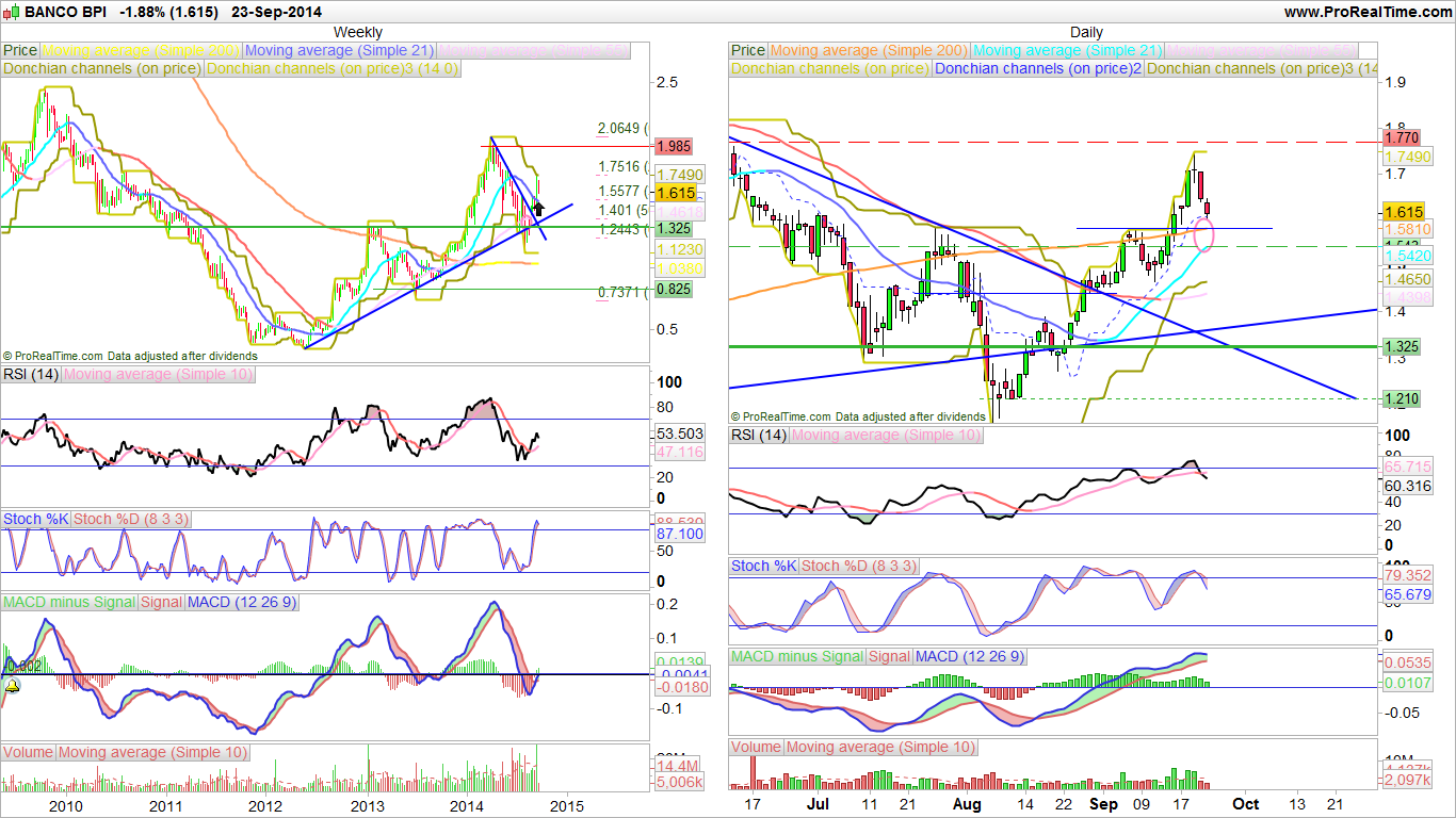 Deixo aqui os gráficos actualizados numa altura em que o BPI, depois de um mês e meio fantástico parou a sua subida perto da sua zona de resistência e aliviando a situação de "sobrecompra" que a subida abrupta tinha criado.