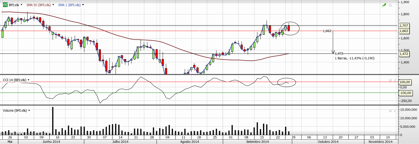 O resultado do cálculo da volatilidade dá-nos um valor que se adequa à zona do último high low, da MM50 dias e muito possivelmente ao PCH14 Down que andará ligeiramente acima desse valor nos próximos dias. Será um suporte de curto prazo que não convinha violar, a fim de manter a sequência de HH e HL verificada desde 7/8/2014.
