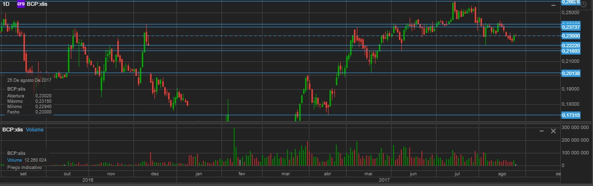 BCP fecha novamente em mínimos nos 0.2258 e abaixo da MM100 . Fecha a semana em mínimos de fecho , mau tecnicamente .
