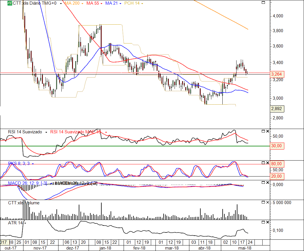 Analisando o gráfico assim corrigido, podemos dizer que o ativo se encontra num suporte depois de um break out. Seria um momento para entradas longas com targets nos 3.45, 3.64, 3.90 e invalidação do trade abaixo dos 3,18.