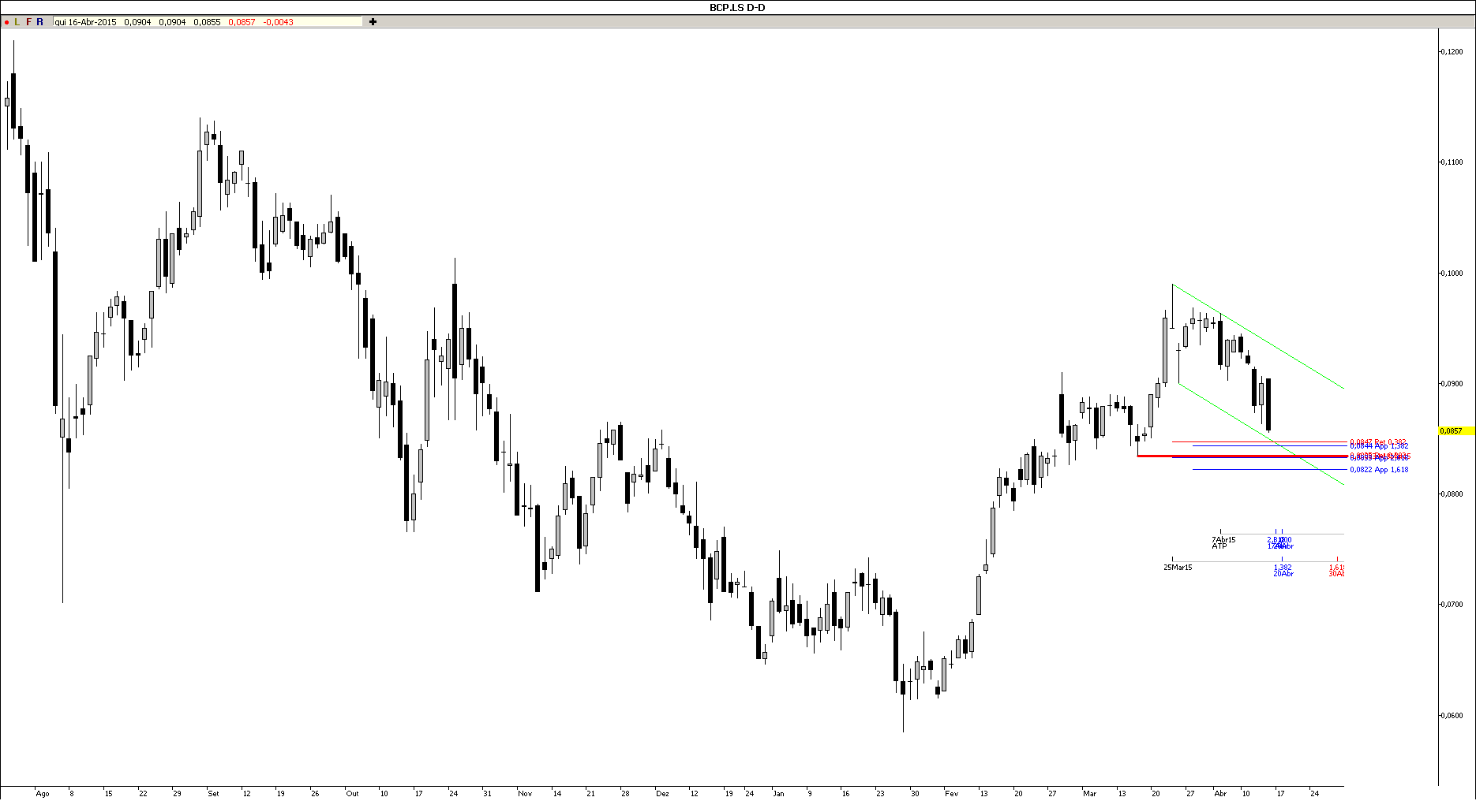 Enquanto não quebrar o que considero um suporte com algum peso, o intervalo 0,083/5, apesar de estar a fazer um pequeno canas descendente, nao tenho motivo para estar pessimista. Se quebrar, aí sim, receio uma visita à casa dos 0,07/5.