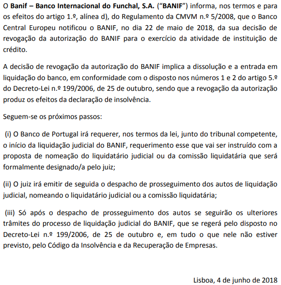 No dia 22 de maio de 2018, o Banco Central Europeu revogou a autorização do Banif – Banco Internacional do Funchal, S.A. (“BANIF”) para o exercício da atividade de instituição de crédito. A decisão de revogação da autorização do BANIF implica a dissolução e a entrada em liquidação do banco, em conformidade com o disposto nos números 1 e 2 do artigo 5.º do Decreto-Lei n.º 199/2006, de 25 de outubro. Desta forma, o Banco de Portugal requereu, nos termos da lei, junto do tribunal competente, o início da liquidação judicial do BANIF.