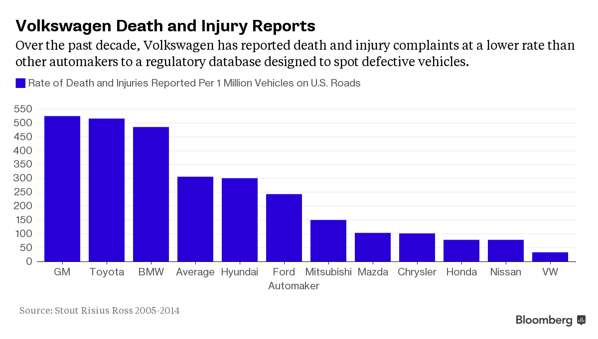 The average reporting rate of the 11 biggest automakers was nine times higher than Volkswagen’s, according to an analysis of government data completed last week by financial advisory firm Stout Risius Ross Inc. at the request of Bloomberg News.