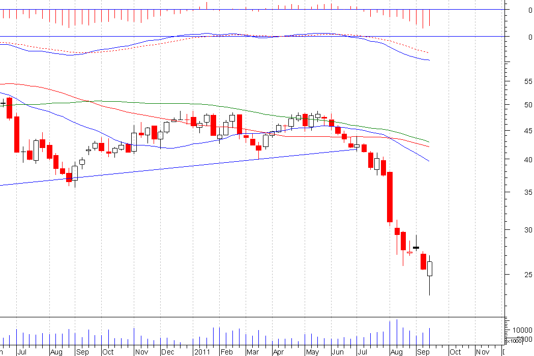 A Lafarge segue firme e forte na sua tendência bearish de longo prazo. A cotação simplesmente não se farta de cair, ao ponto de recentemente ter disparado um forte sinal bearish ao romper em baixa a sua Cunha Descendente de médio prazo.