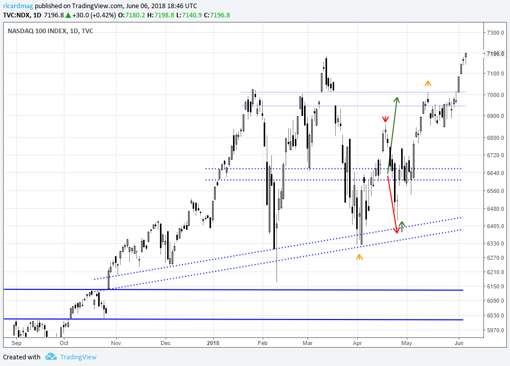 Continuo a achar que isto está esticadissimo e, se há coisa curiosa , é ver o NDX cair com velas verdes diarias com lower lows e lower highs, mas fazendo diárias verdes