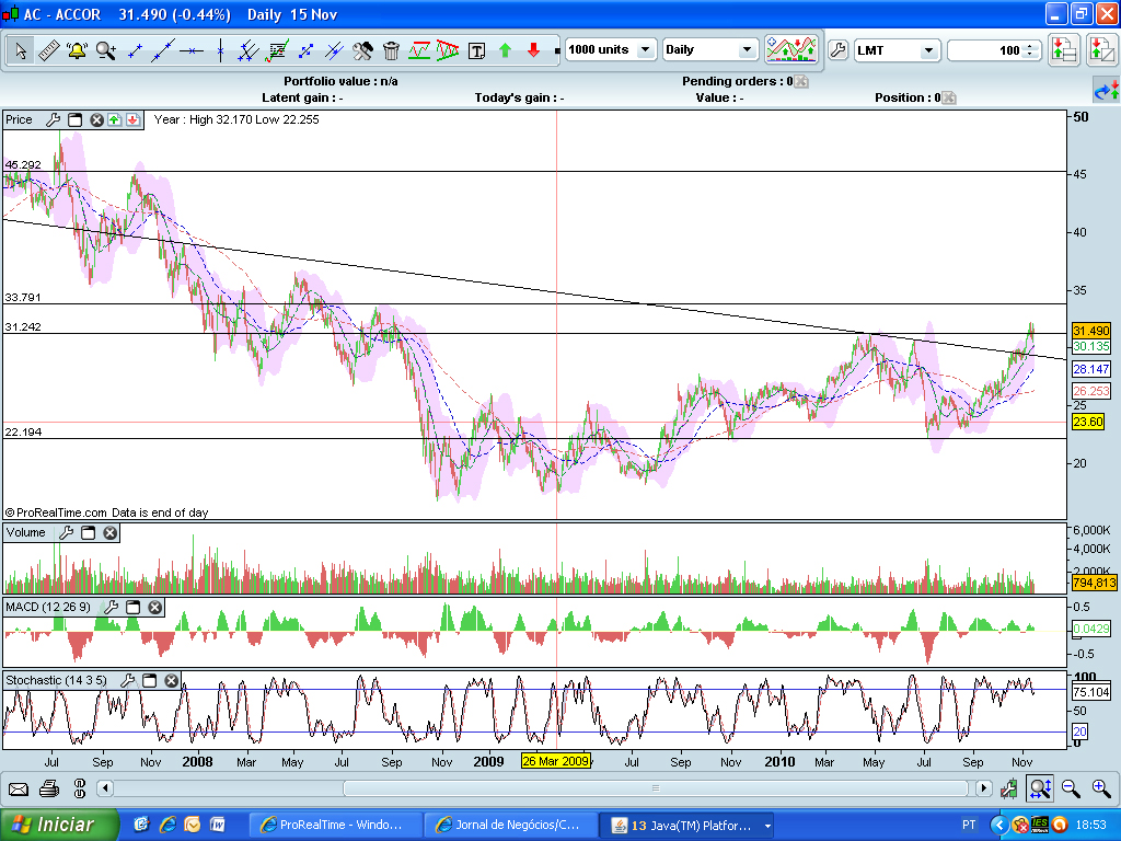Apesar do volume tremendamente reduzido das 2 últimas sessões, que contrastam fortemente com o grande volume registado na queda de quinta-feira, a Accor continua a transaccionar acima dos € 27,00, finalmente desgarrada do seu suporte dos € 25,80, o que parece indicar que devemos estar diante do início do rebound que (espero) poderá levá-la aos € 31,00.