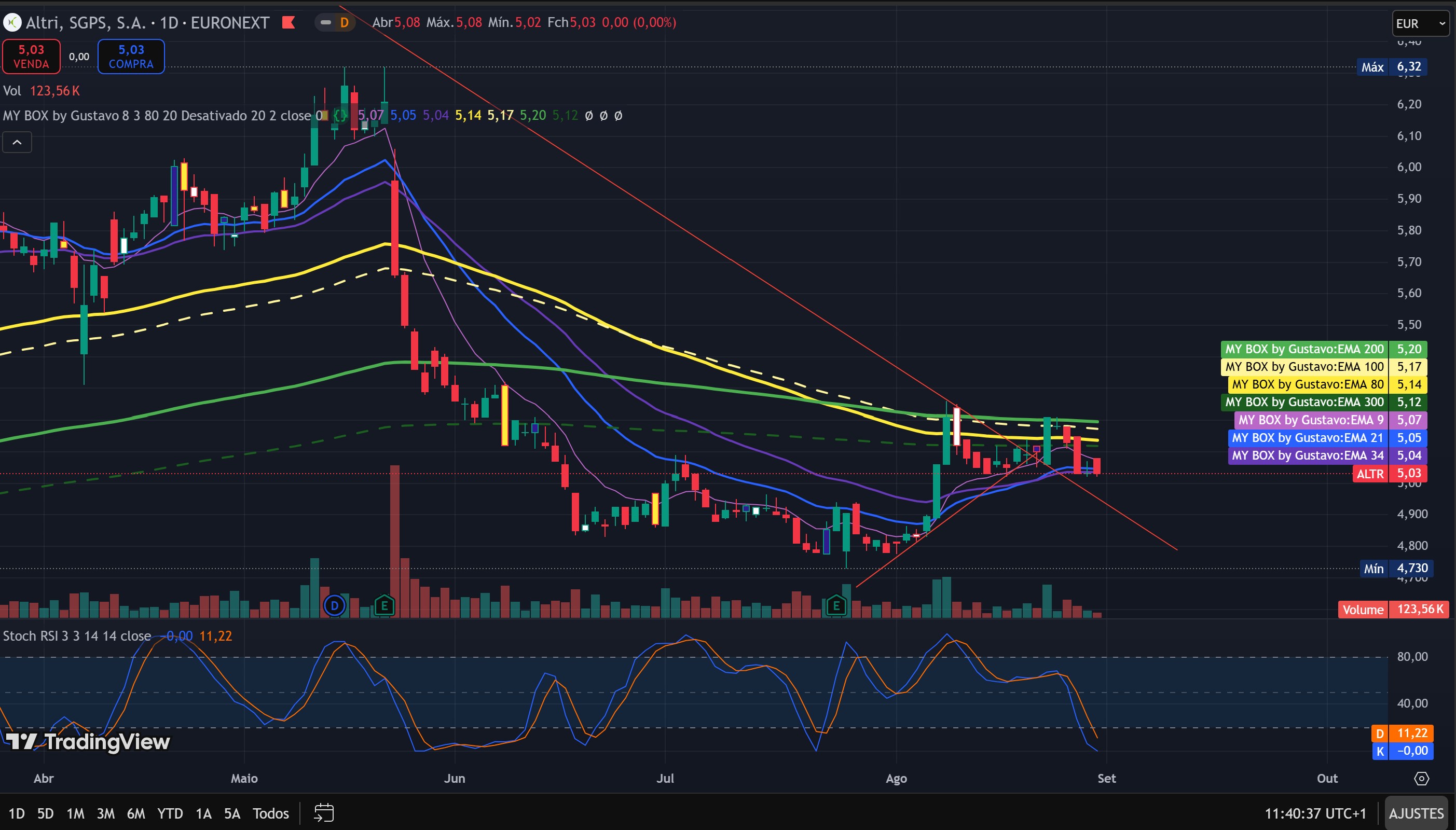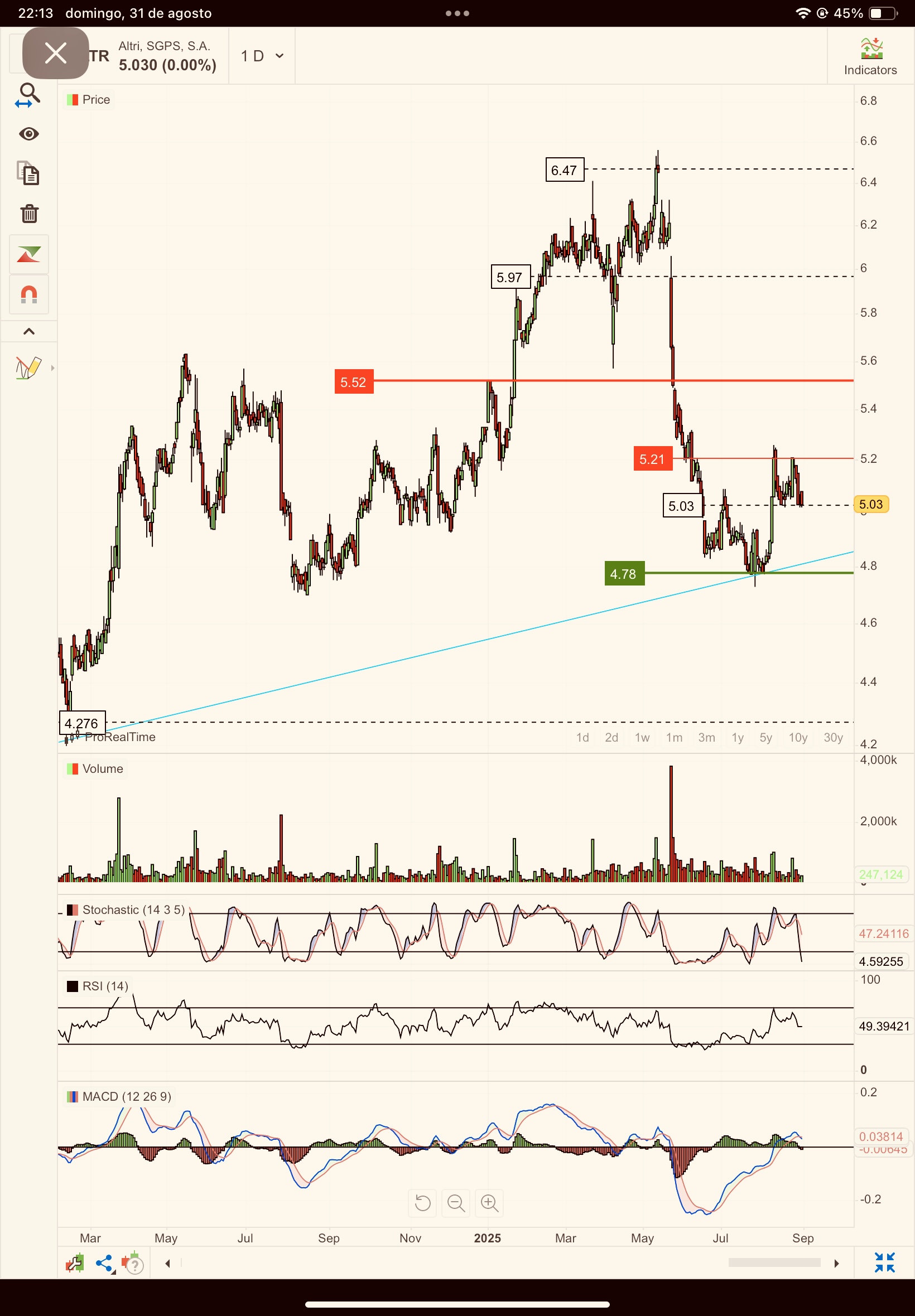 É claro. Pela imagem que me forneceu, que mostra um gráfico de velas da ação Altri, SGPS, S.A. (ALTR) na Euronext Lisboa, posso fazer a seguinte análise técnica, considerando as linhas de tendência desenhadas e o comportamento das velas: