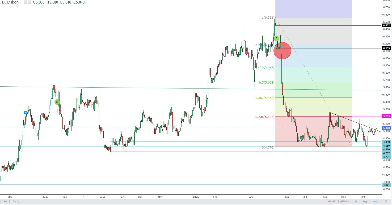 Cenário Otimista (Continuação do Canal): Se a linha de suporte inferior do canal (próximo de 4,830) aguentar e o preço reverter para cima, a perspetiva é de uma recuperação em direção ao meio ou à resistência superior do canal.