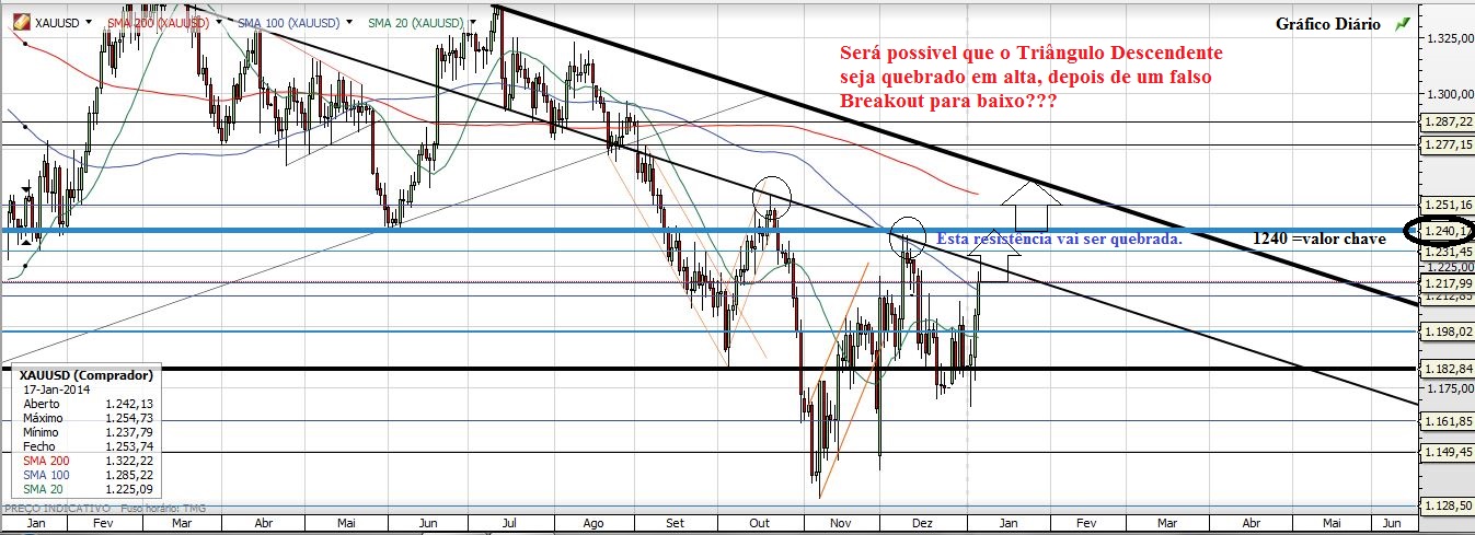 Perante este cenário, e visto ter acontecido aquele falso Breakout para baixo, estou mesmo muito inclinado para a quebra em alta. Se assim for vou entrar Longo no Ouro.