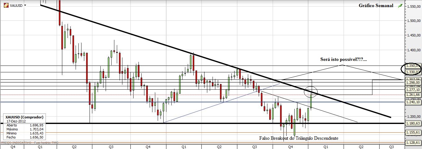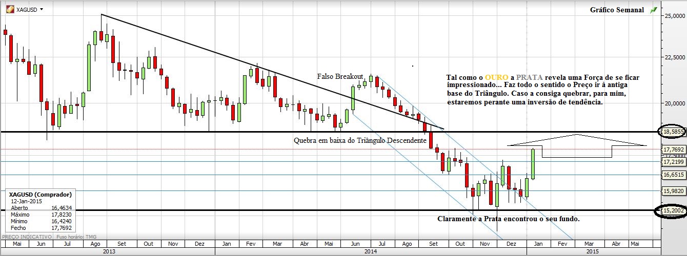 De notar ainda, no caso do Ouro, que o Triângulo quebrou primeiro em baixa, revelando-se esta uma falsa quebra. Agora quebra em alta o que, segundo alguns Mestres, poderá ter um efeito de força ainda mais explosiva. Mas esqueçamos os Mestres e reparemos no Gráfico Semanal da Prata e no seu Triângulo Descendente e observe-se a falsa quebra em alta e o movimento seguinte de reentrada no Triângulo e observe-se bem até onde é que o Preço foi parar... Será que agora se irá passar uma situação inversa, mas com força semelhante no Ouro? Se eu acredito nos Triângulos Descendentes tenho que acreditar também que o movimento será para cima e em Força. Neste sentido, e na senda da anterior análise, estou naturalmente Longo no Ouro.