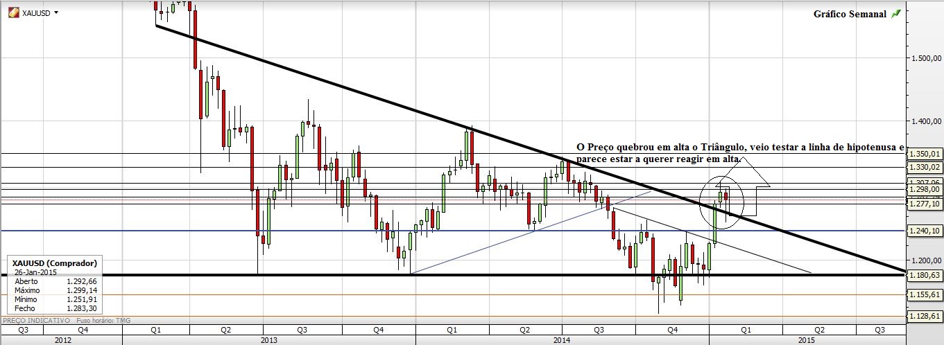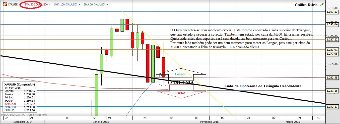 O Ouro encontra-se num momento crucial. Hoje foi à linha de hipotenusa do enorme Triângulo Descendente onde o Preço se tem desenvolvido ao longo dos últimos vastíssimos meses. O Ouro está com muita Força, mas agora chegou o momento da verdade... ou vai ou racha. Se conseguir quebrar em alta o Triângulo Descendente pode ser também o inicio de uma inversão da tendência.