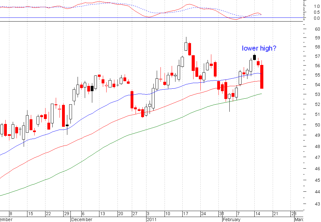 - no curto prazo o panorama é menos risonho: em Fevereiro fez um máximo relativo inferior ao de Janeiro; na sessão de hoje foi o patinho feio do DAX ao cair 4,36% (e pelo peso que tem no índice contribuiu para a fraqueza relativa do índice alemão na sessão de hoje); e já quebrou em baixa as suas médias móveis; o Chaikin Money Flow caiu para valores que já não se viam desde Julho do ano passado. Pode ser que seja apenas mais uma correcção mas os sinais sugerem que possa estar iminente uma viragem para baixo. É importante observar a zona dos 51 - se esta for quebrada em baixa, acredito numa aceleração das quedas até aos 44-45 (isto admitindo a hipótese de uma cabeça-e-ombros com neckline ascendente, mas é claro que aqui já sou eu a fazer filmes