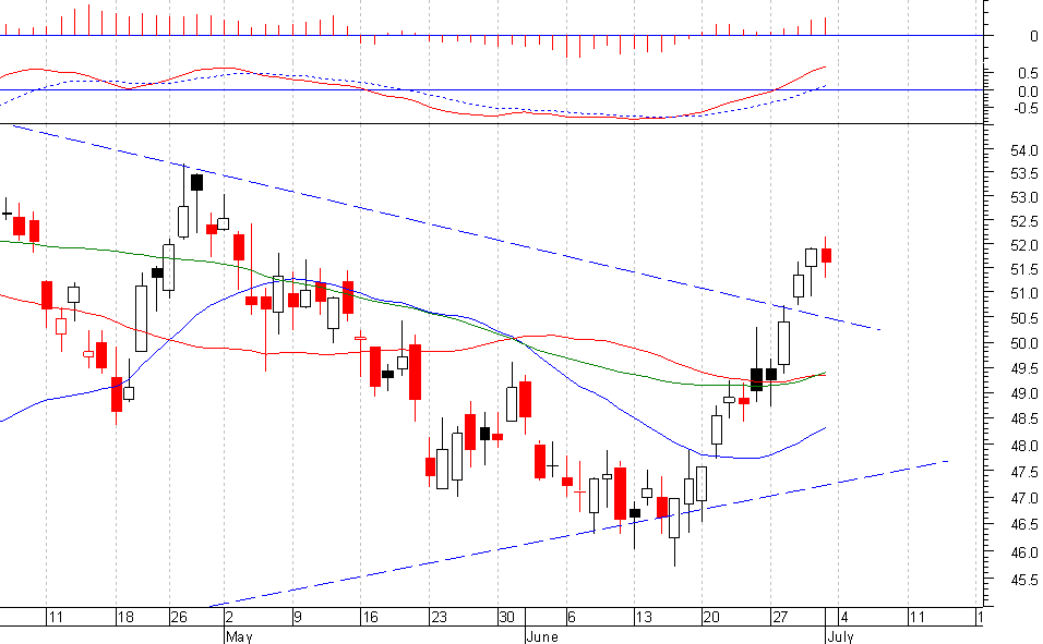 Mantenho como target a zona dos € 52,00 / € 53,00 (projecção baseada no seu último rebound) e um stop curto ligeiramente abaixo do seu suporte.