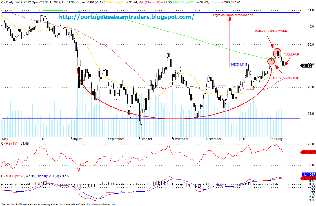 Face à cotação actual do citi, queria incidir mais a análise no curto prazo. Conforme se pode verificar o Citi fez um fundo arredondado durante praticamente sete meses. Várias vezes olhei para o seu gráfico a tentar perceber que formação se estava a desenvolver e só já quase na fase do breakout é que consegui perceber o que verdadeiramente estava a acontecer em termos de AT.