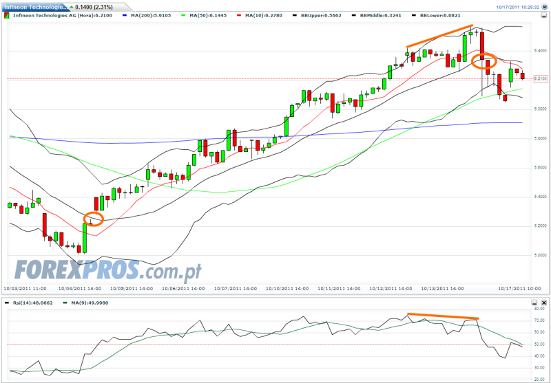A Infineon apresenta uma divergência negativa no gráfico horário e encontra-se a negociar entre a banda inferior de Bollinger e a MM20 da banda, o que já não acontecia desde o inicio do actual swing ascendente. Se fizer um mínimo abaixo dos 6,05 poderemos ter nova queda até à zona dos 5-5,2 que tem aguentado bem ultimamente.