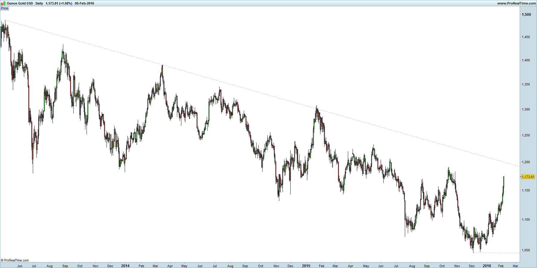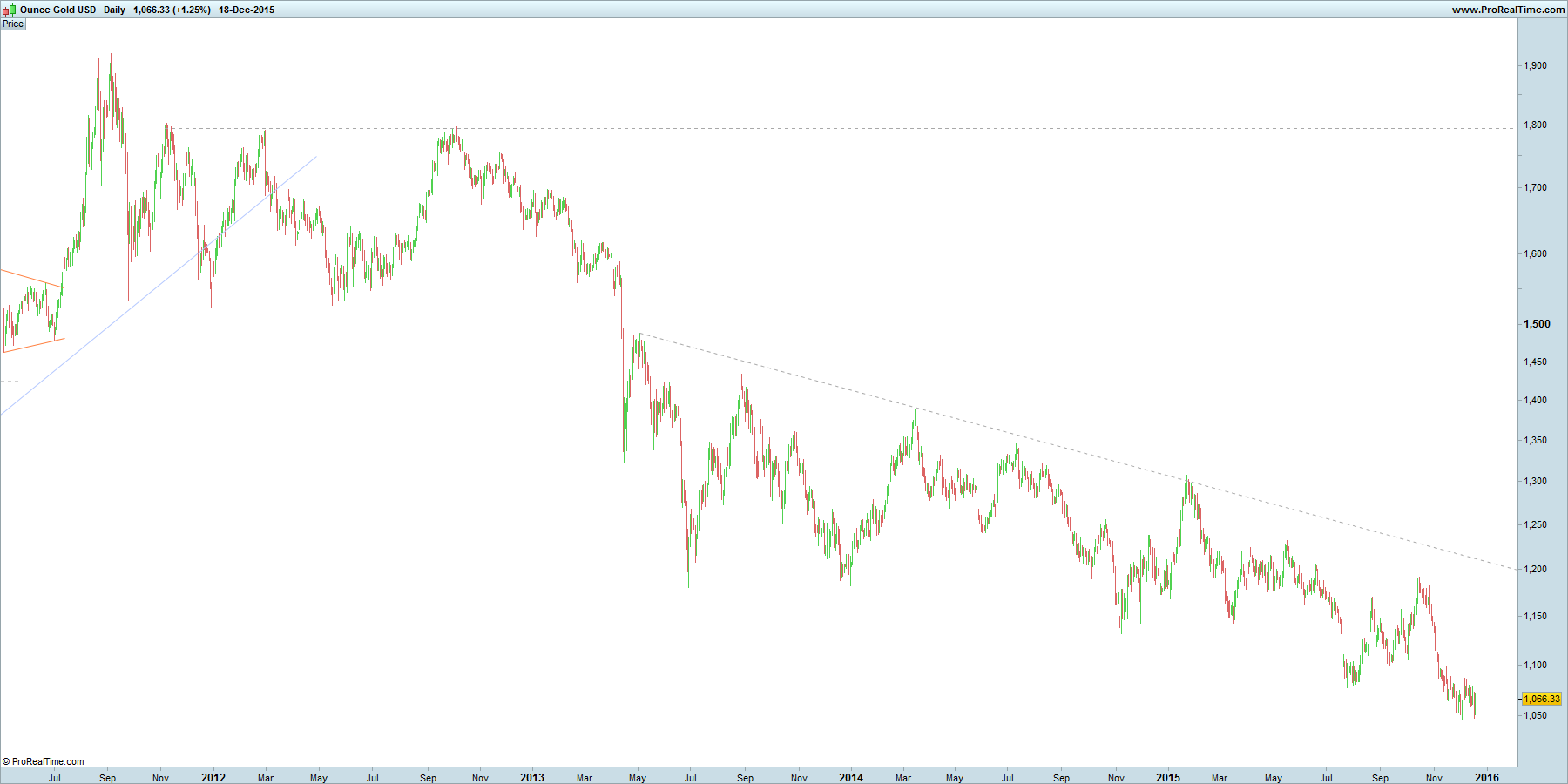 olhando para o gráfico de longo prazo é curioso reparar em como, apesar de tudo, o ouro continua mais caro do que no auge do bull market terminado em 2008