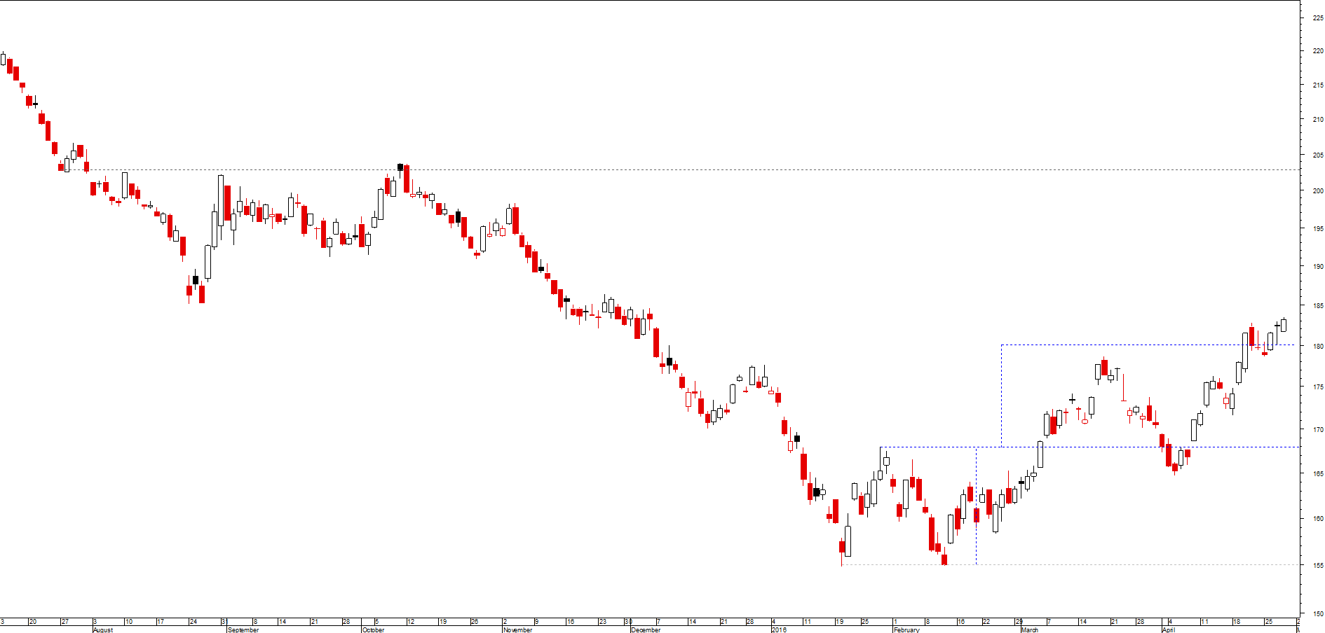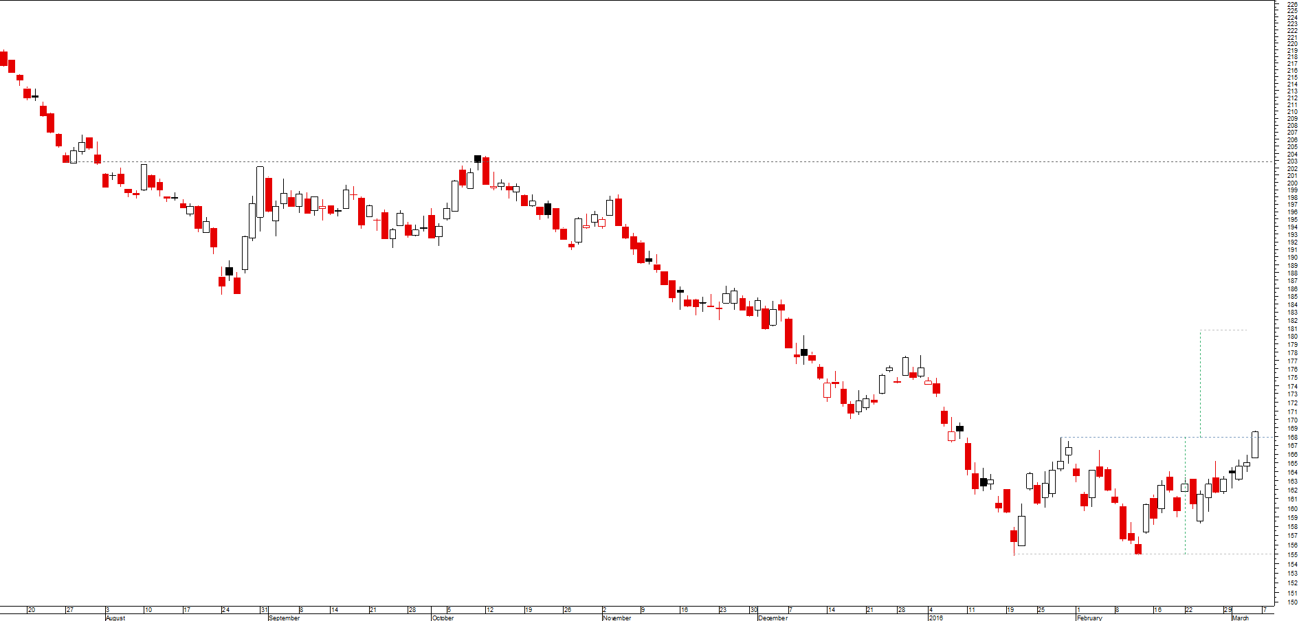 Creio que o sinal importante para tomar posiçoes longas nas “commodities” terá sido dado no gráfico no passado dia 4 de março, há quase 2 meses atrás.
