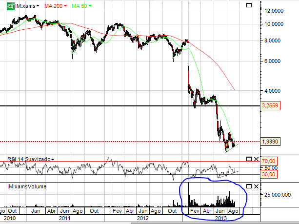 Depois de um bear-market terrível que vem desde 2010, que levou a cotação a descer desde os 11€ até aos 1,75€ (para já?!), esta acção chamou-me a atenção pelo seu comportamento nos últimos tempos.