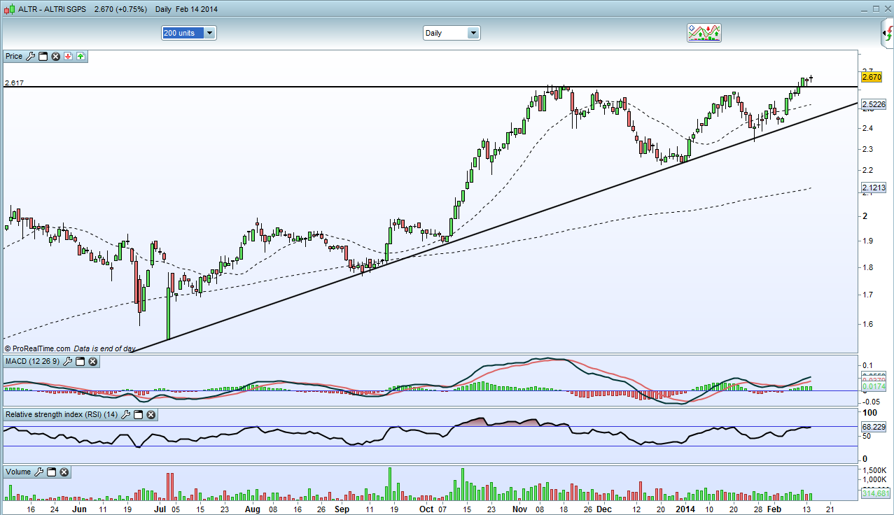 A Altri está novamente em maximos após ter "rompido" a resistencia dos +/- 2,67. O rompimento não foi com a força desejavel por isso qualquer entrada será com stop logo abaixo dos 2,67. Vou ver como corre segunda para entrar ou não.