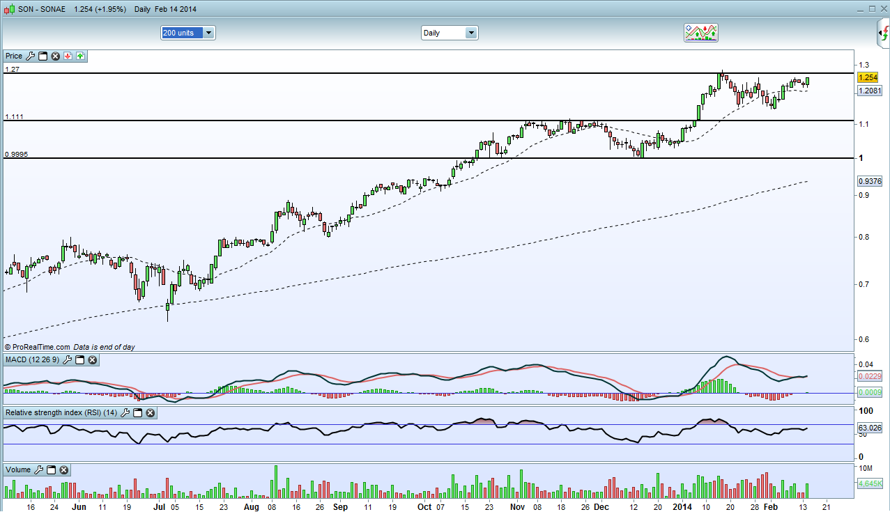 A SON está proxima de máximos no diário, e no semanal está em cima do maximo mais recente, tendo feito um bulish engulfing depois de duas semanas a corrigir. O MACD cruzou a linha de sinal o que pode ser bom indicio mas por outro lado, este não tem acompanhado a cotação, podendo fazer uma difergencia bearish. Como o movimento de subida que poderá ter criado esta possivel divergencia foi muito forte, vou dar menos importancia a esta possivel divergencia.
