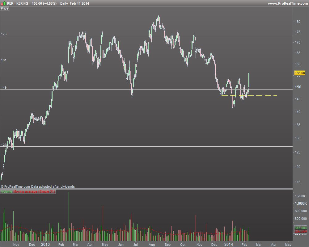 A tendência de longo prazo da Kering é nitidamente ascendente (desde finais de 2008 até agora valorizou quase 500%) e a ação passou 2012 a lateralizar num range de mais ou menos 20% - considero portanto que no médio prazo não existe tendência definida. No entanto, o facto de ter feito recentemente um higher low e de ter nesta última sessão quebrado os 153€, onde houve indícios de força vendedora em finais de dezembro e finais de janeiro, leva-me a crer que no curto prazo a tendência é ascendente. O stop ficará nos 146,5€ - 6% abaixo da cotação atual.