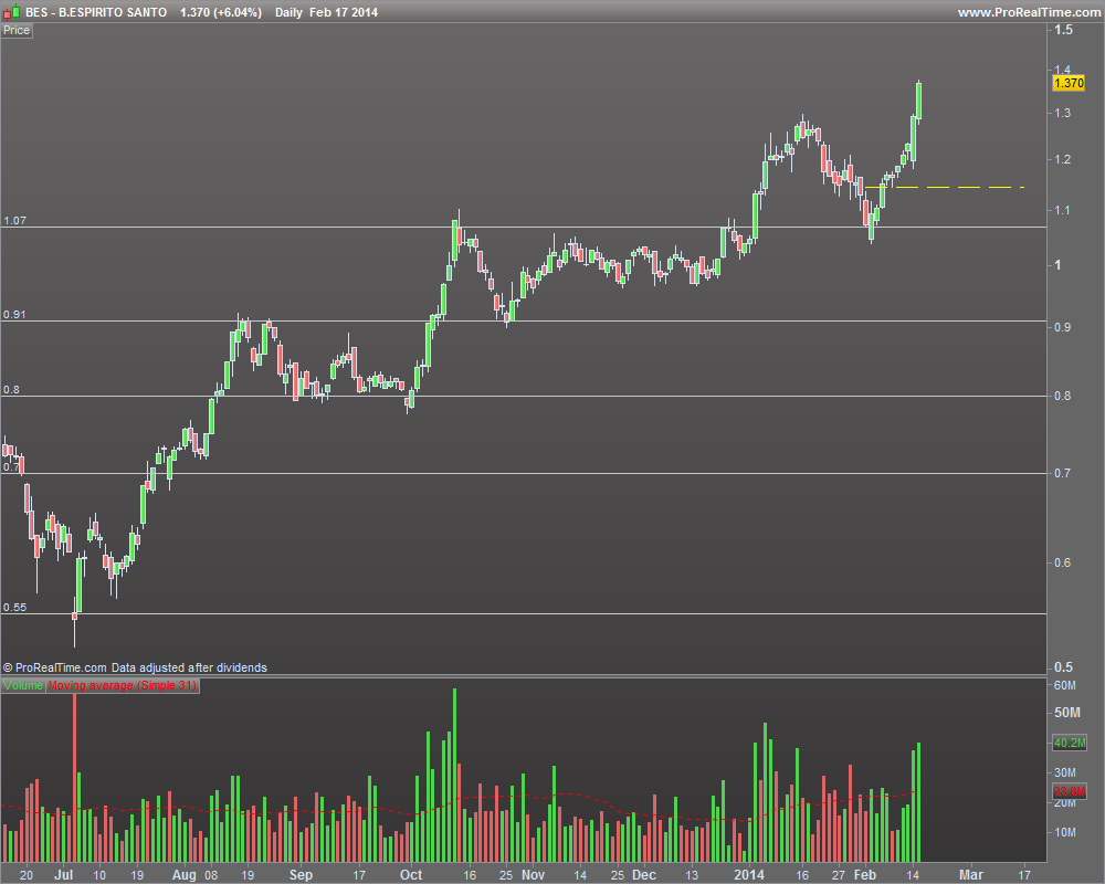 Por fim no BES, dado que está 40% acima do último suporte relevante e uma vez que não estou disposto a deixar essa valorização desaparecer mantendo o stop abaixo do suporte (1,07), caio na última situação, tendo que escolher um stop sem referências claras, mas onde o último swing altista está em vias de ser comprometido.