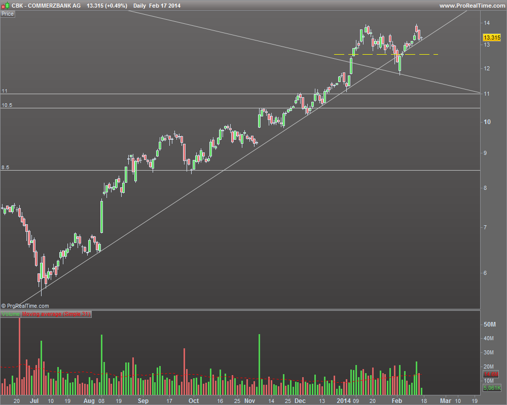 No Commerzbank a falha em fazer novos máximos, tendo apenas sido igualados os anteriores, deixa-me de pé atrás e subo o stop. Considero que abaixo dos 12,57 a figura já fica demasiado feia.
