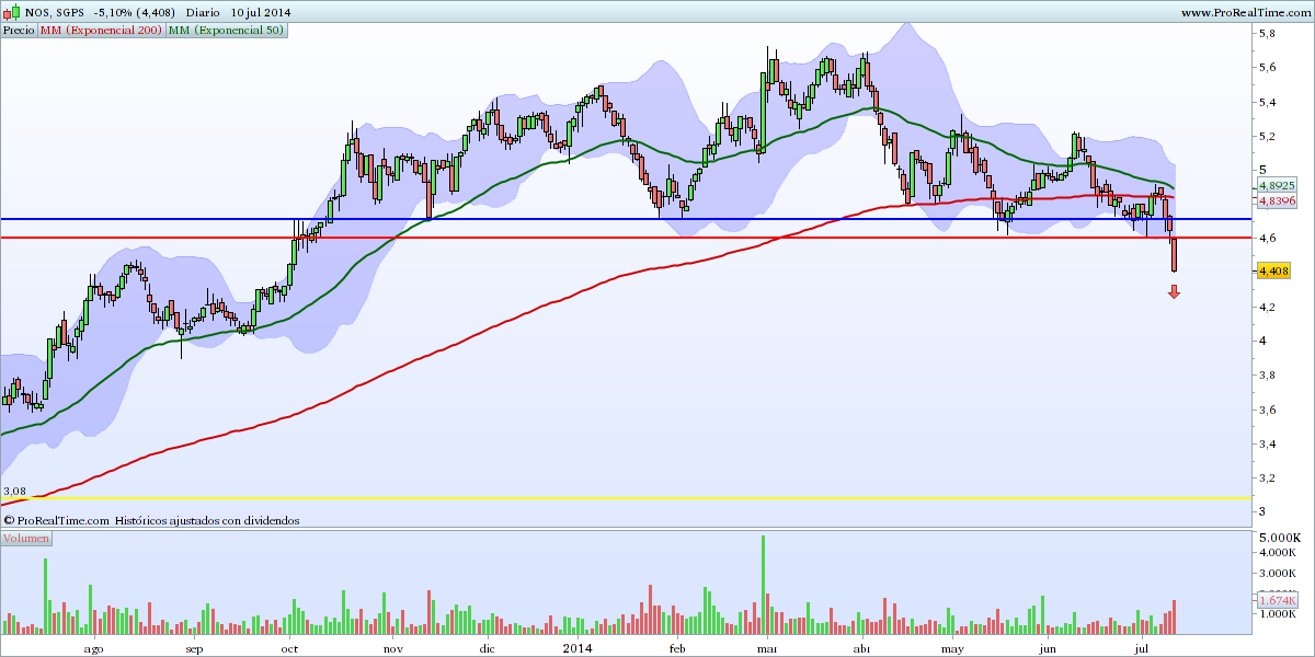 Os motivos são conhecidos, temos a cotação no lado de baixo da mm200, abaixo do suporte na zona dos 4.70 eur, médias a inverter o sentido ascendente e com death cross à vista.