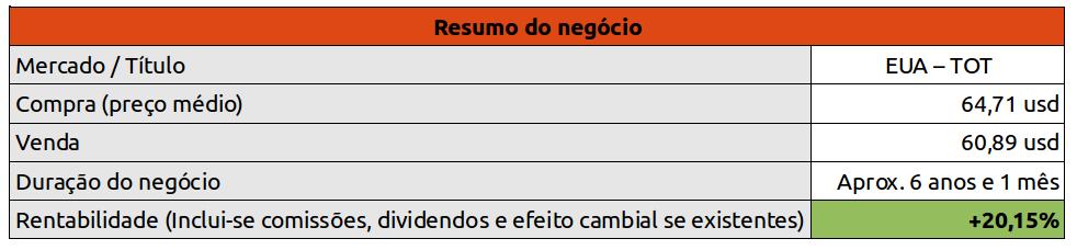 Como já tinha fechado a posição, nem me apercebi que ainda faltava receber um trimestre de dividendos. Sendo assim, a rentabilidade que postei anteriormente no resumo do negócio da TOT, está errada. Faltam ali uns pós.
