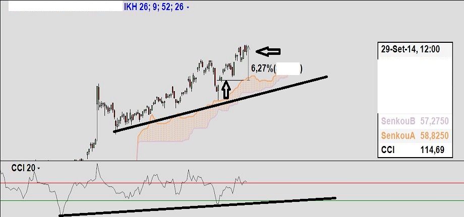 em 23-9 dissemos, a propósito de certo activo: Seguindo os critérios mencionados (nuvem e cci 20) podemos ver que o preço desloca-se por cima da nuvem e o cci 20 sai da zona de sobrevenda. A nuvem no seu todo poderá dar-nos suporte. Também temos uma linha de suporte horizontal. Amanhá será dada ordem de compra do activo com os habituais parâmetros de lucro e stoploss. Hoje dizemos o mesmo para o activo cujo gráfico apresentamos, apenas com uma ligeira correcção: o cci ainda não deu sinal de saída da zona de sobrevenda. Como é um indicador atrasado, isso não nos preocupa dada a existência de outros parâmetros técnicos, mormente a realção entre o risco que assumimos e o lucro que perseguimos.