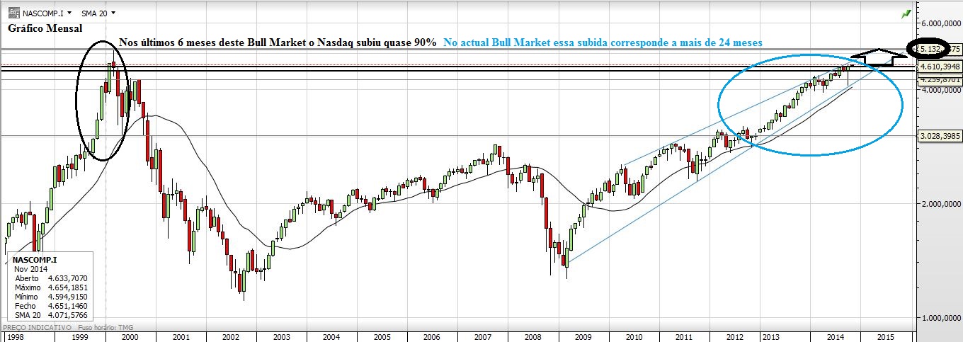 Olhando para a bolha do NASDAQ de 2000 e olhando para o seu Bull Market actual acho que as situações são bem diferentes e ainda estão muito longe do cenário que no passado aconteceu. Essa é aliás uma das razões que me levam a achar que novos máximos iram acontecer regularmente nos próximos tempos. Não sei onde está a nebulosa, para já tudo está muito claro no que ao sentido e força dos índices americanos diz respeito.