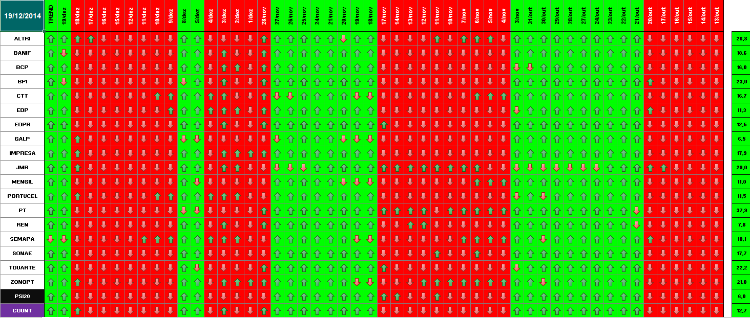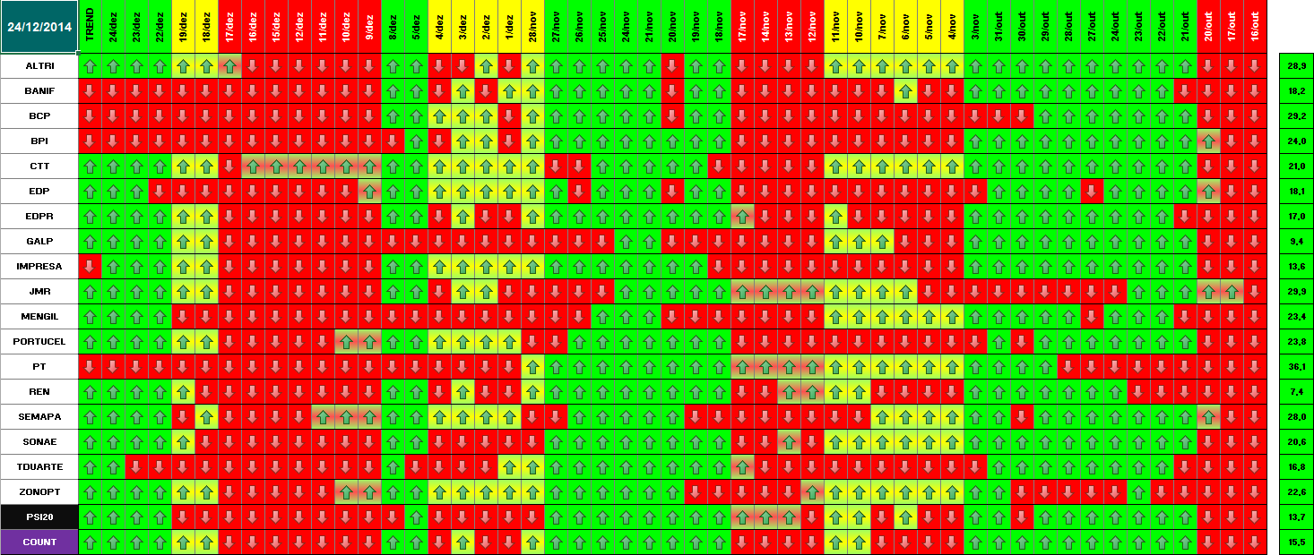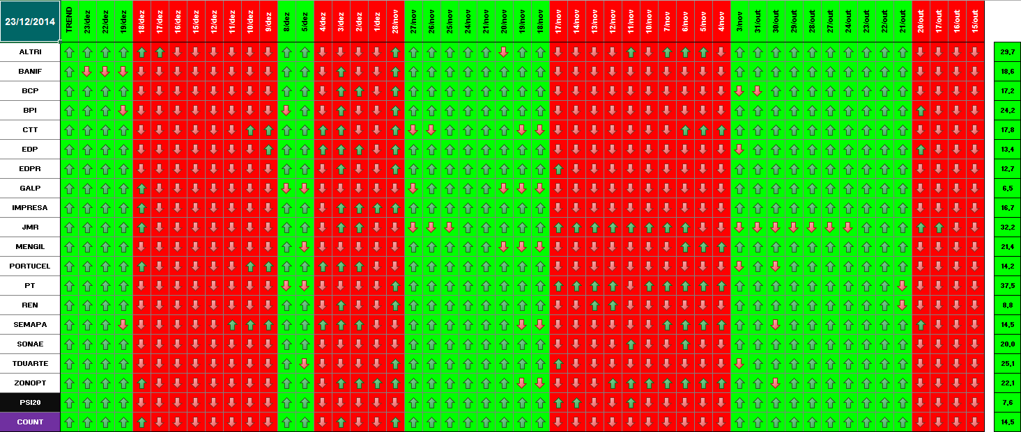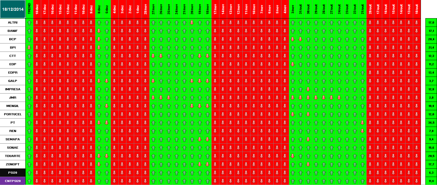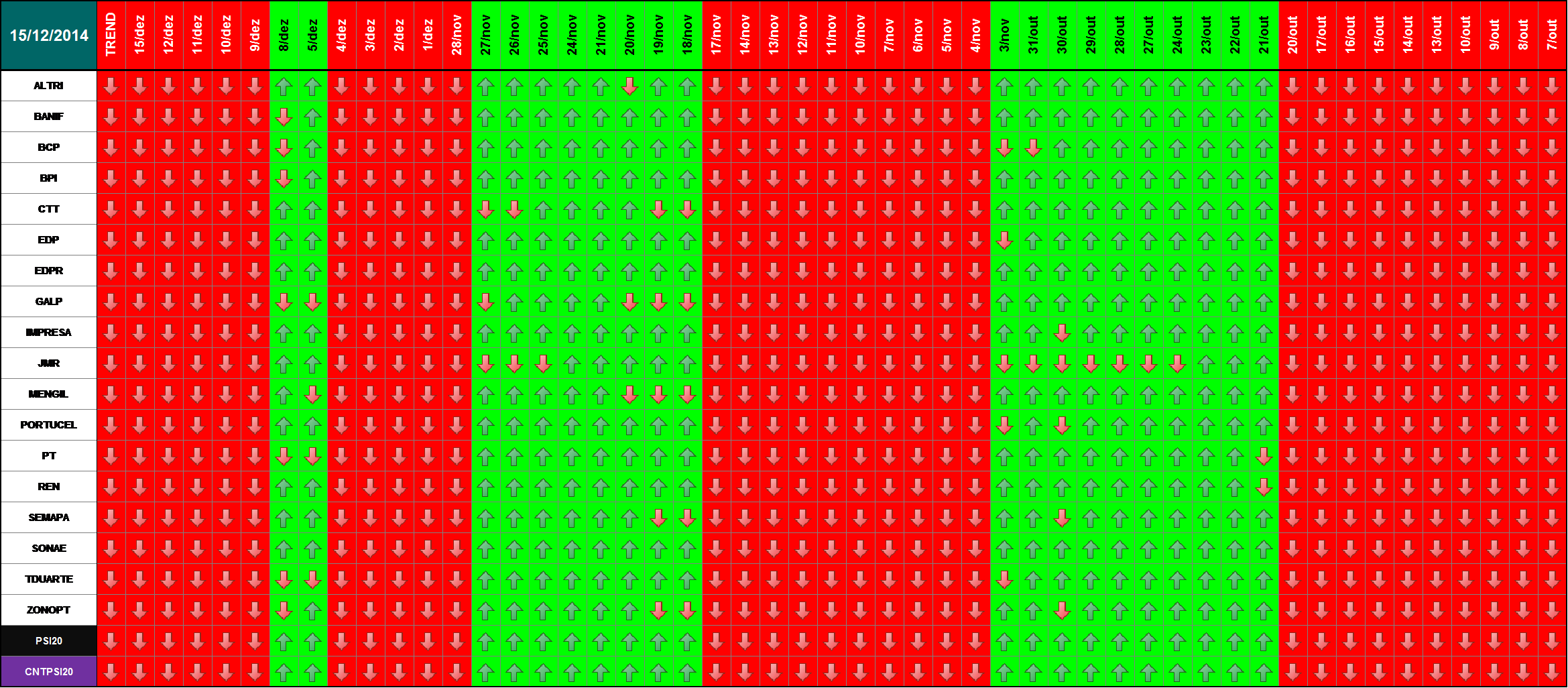 Segue em baixo informação / quadros atualizados com os dados de 18 de Dezembro de 2014. Se amanhã se confirmar este optimismo, o modelo deu sinal de presença no mercado. Hoje já se verificou essa informação para alguns títulos. Dos 18 títulos que compõem o PSI 20, metade (9) já deram sinal de entrada. Quanto ao optimismo de hoje e tendo em conta o sucedido a nível mundial (subida generalizada e com muita força em todas as praças), parece-me inquestionável que os investidores estão confiantes para os próximos dias.