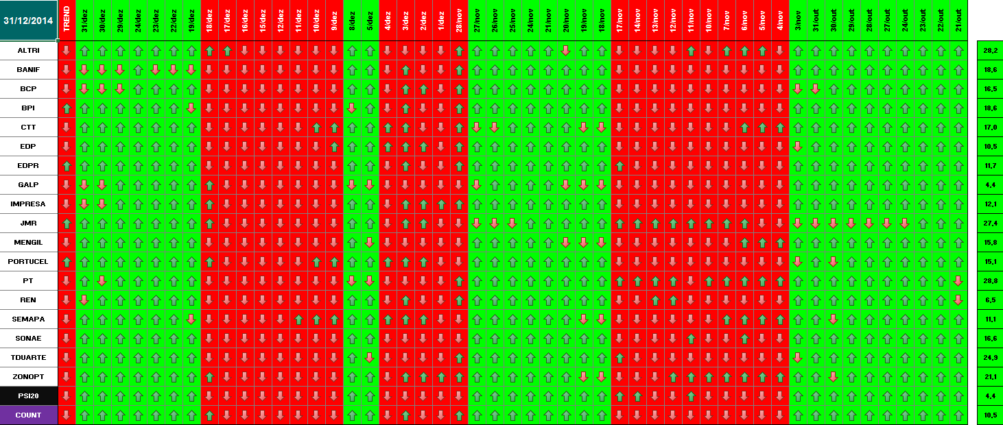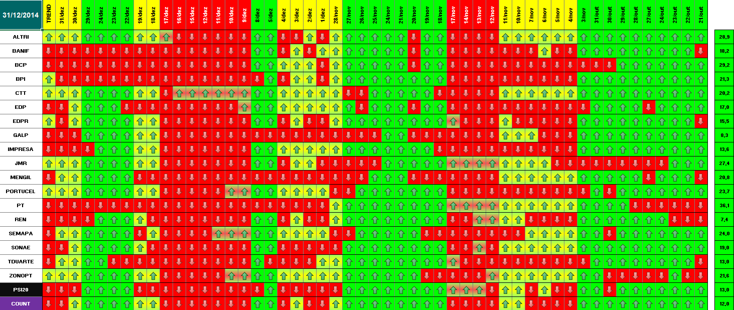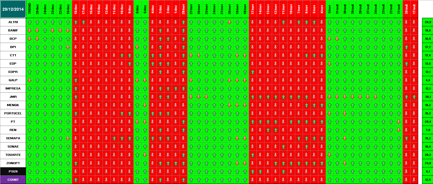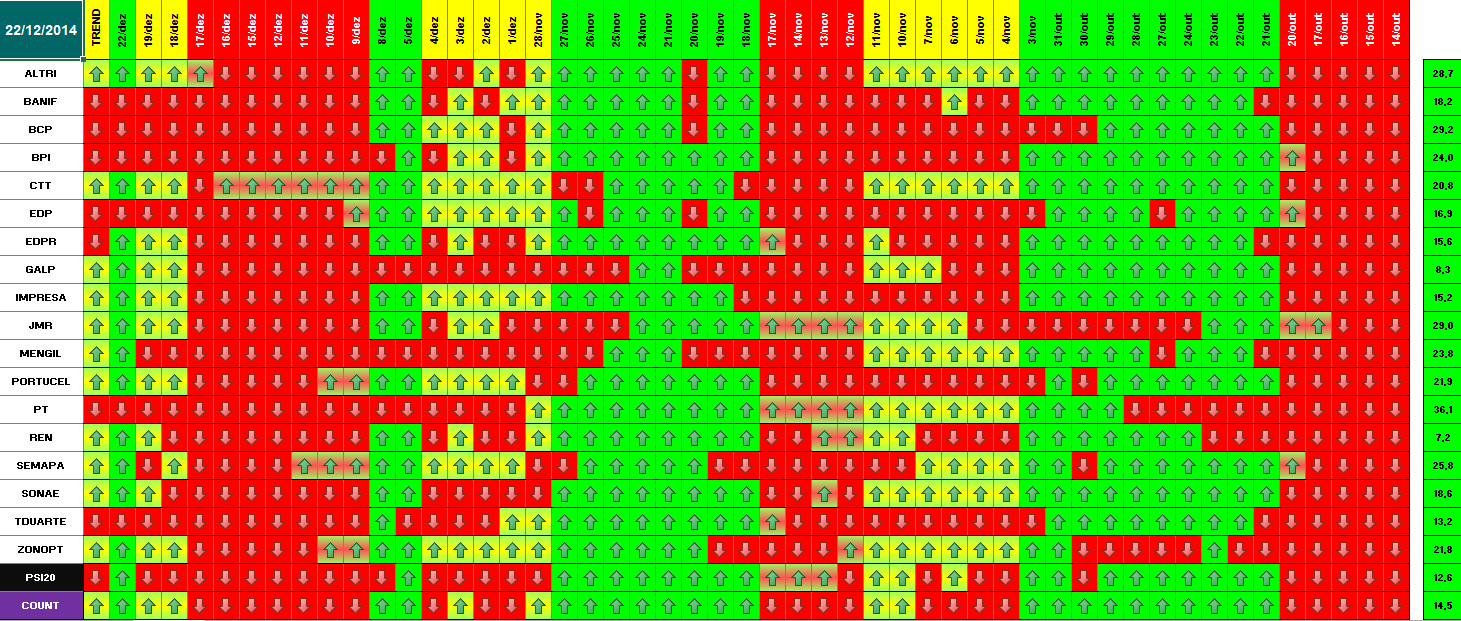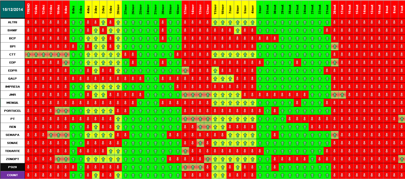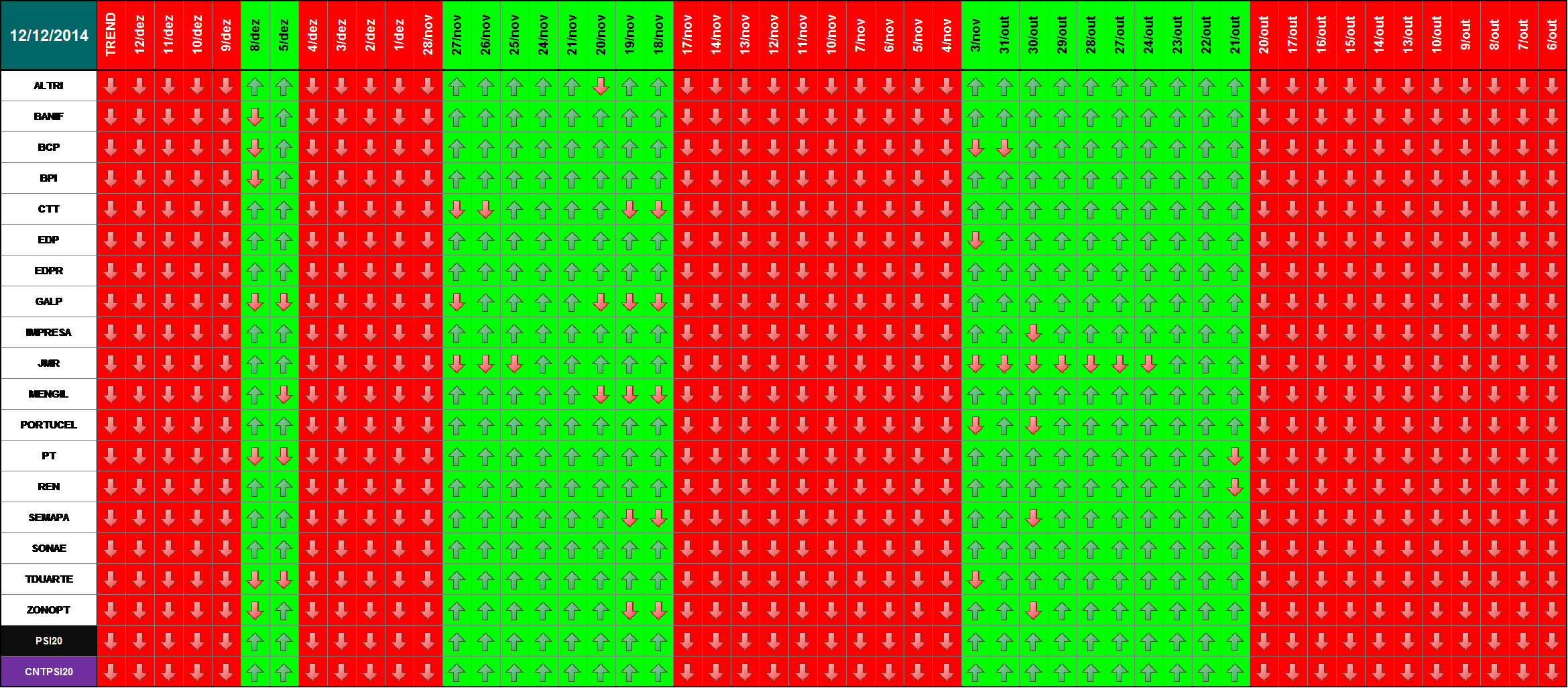 Segue em baixo informação / quadros atualizados com os dados de 18 de Dezembro de 2014. Se amanhã se confirmar este optimismo, o modelo deu sinal de presença no mercado. Hoje já se verificou essa informação para alguns títulos. Dos 18 títulos que compõem o PSI 20, metade (9) já deram sinal de entrada. Quanto ao optimismo de hoje e tendo em conta o sucedido a nível mundial (subida generalizada e com muita força em todas as praças), parece-me inquestionável que os investidores estão confiantes para os próximos dias.