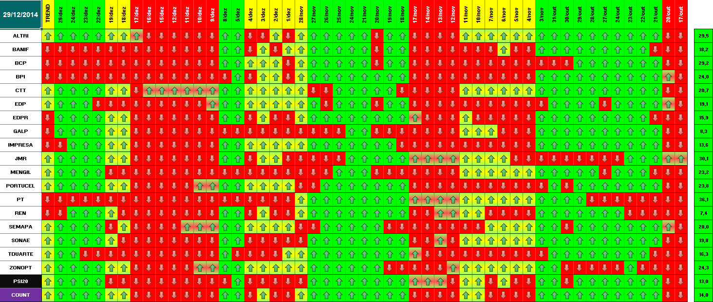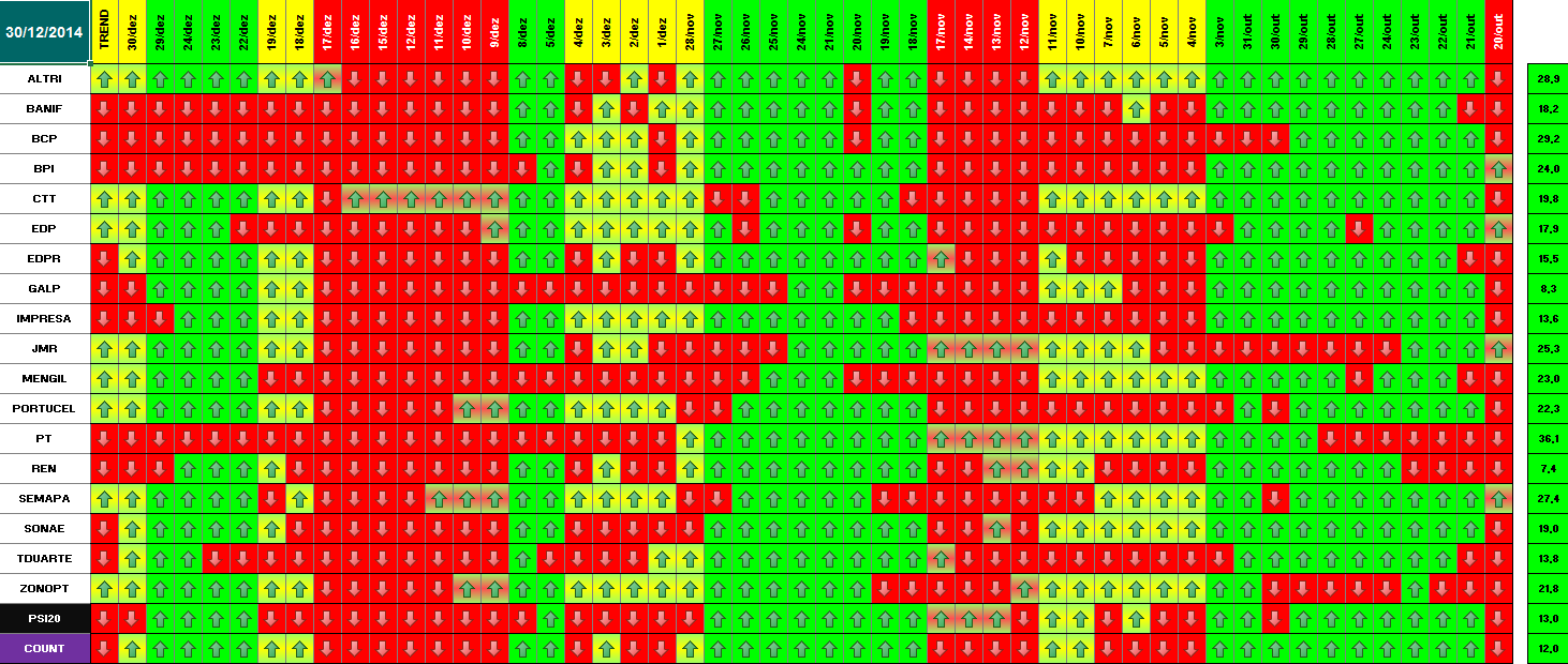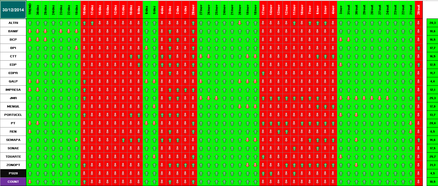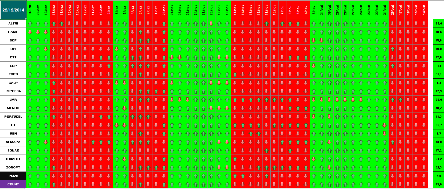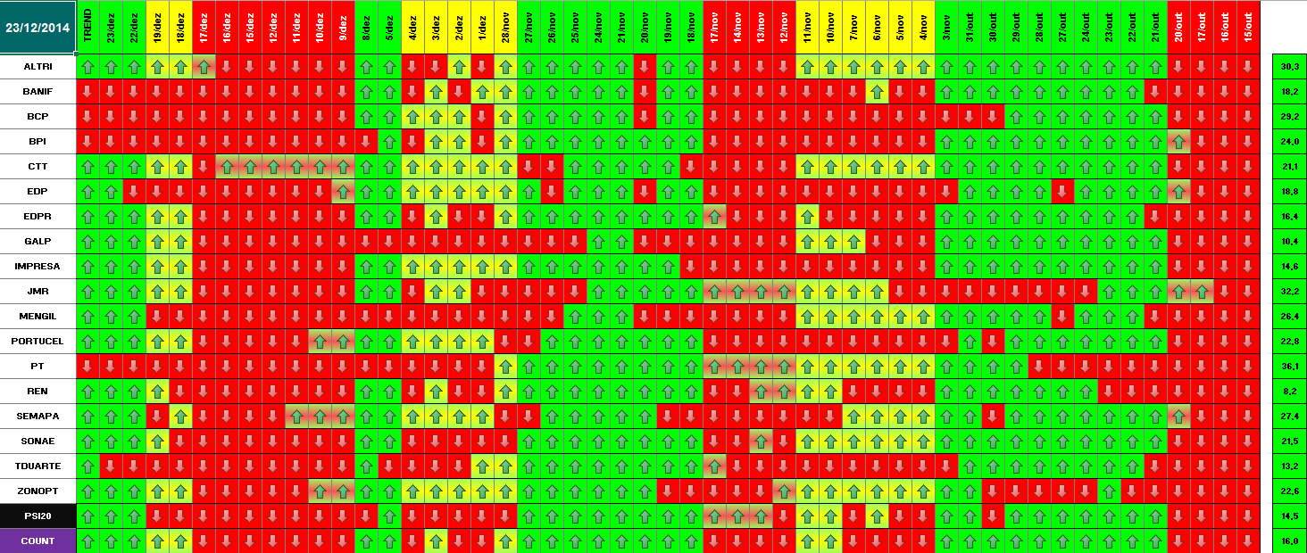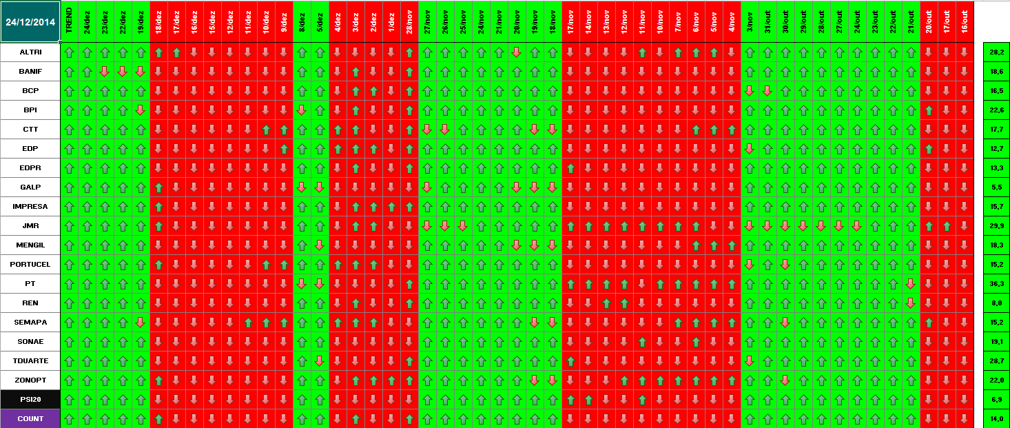 Segue em baixo informação / quadros atualizados com os dados de 18 de Dezembro de 2014. Se amanhã se confirmar este optimismo, o modelo deu sinal de presença no mercado. Hoje já se verificou essa informação para alguns títulos. Dos 18 títulos que compõem o PSI 20, metade (9) já deram sinal de entrada. Quanto ao optimismo de hoje e tendo em conta o sucedido a nível mundial (subida generalizada e com muita força em todas as praças), parece-me inquestionável que os investidores estão confiantes para os próximos dias.