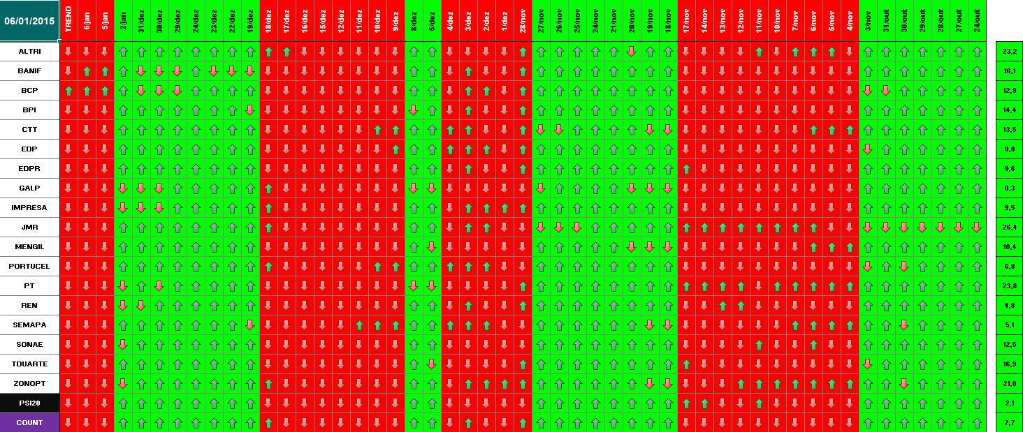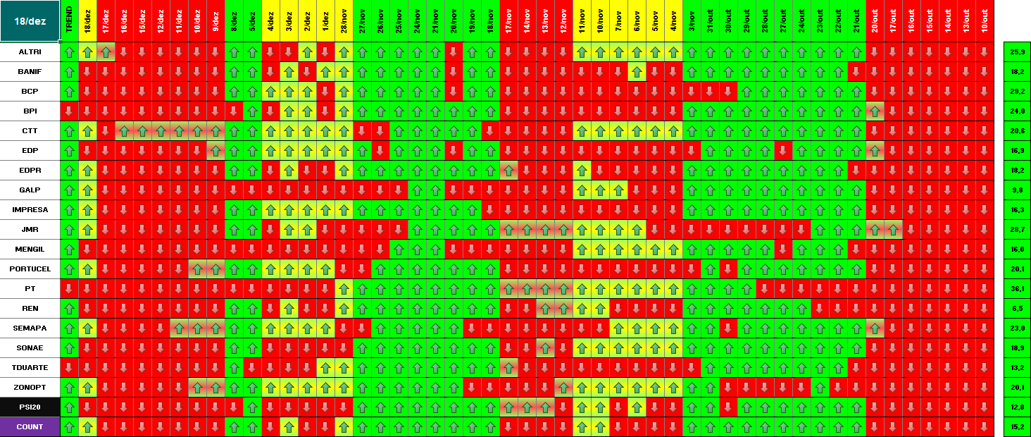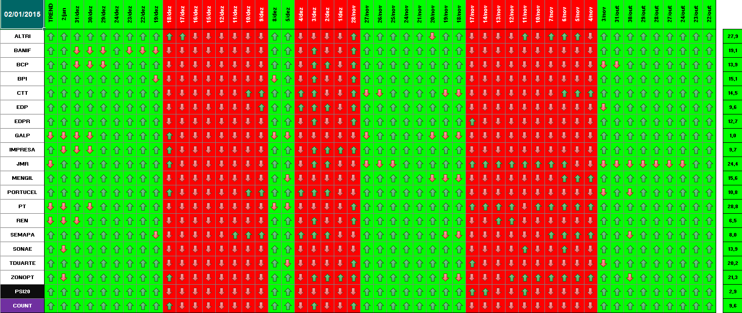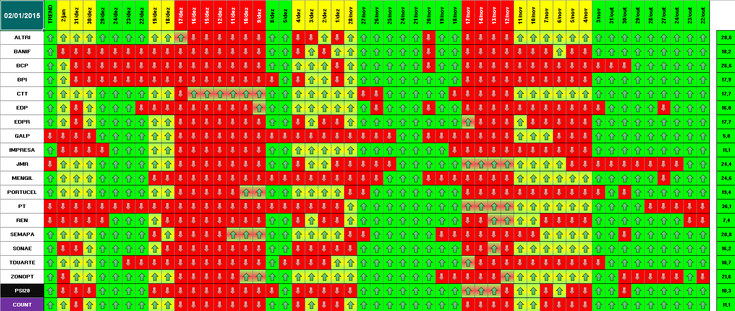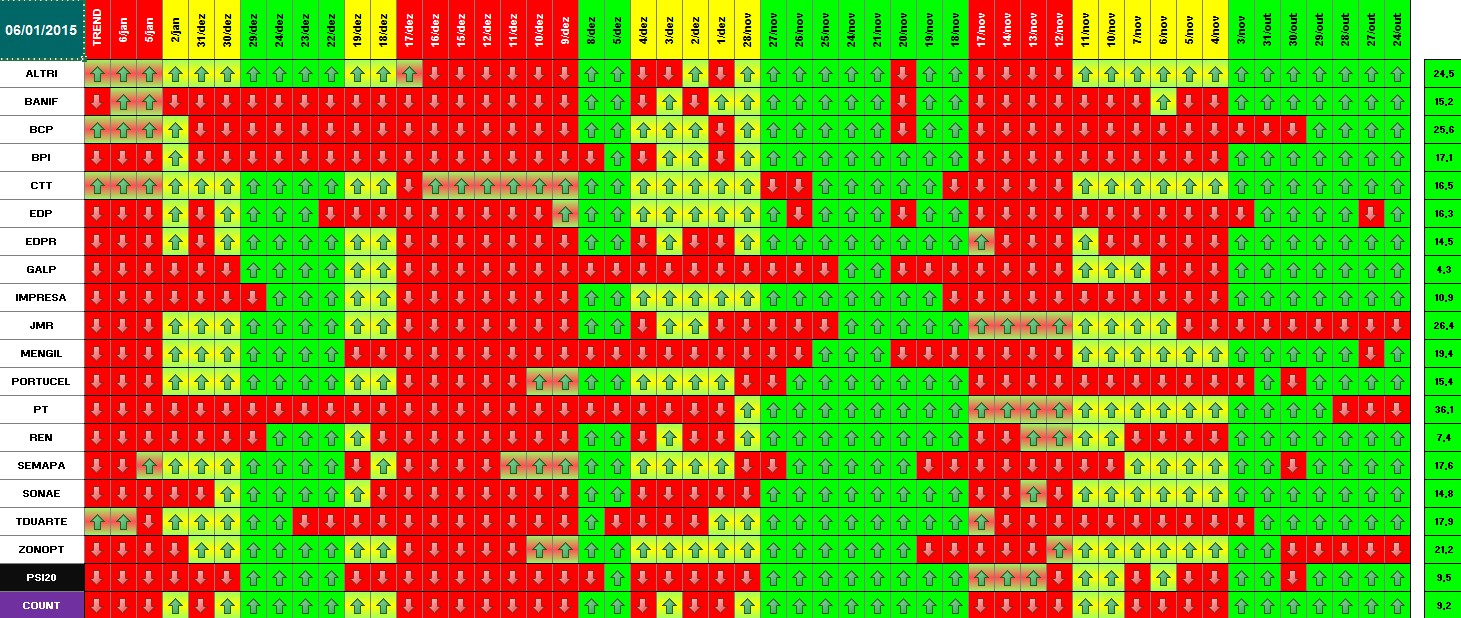 Segue em baixo informação / quadros atualizados com os dados de 18 de Dezembro de 2014. Se amanhã se confirmar este optimismo, o modelo deu sinal de presença no mercado. Hoje já se verificou essa informação para alguns títulos. Dos 18 títulos que compõem o PSI 20, metade (9) já deram sinal de entrada. Quanto ao optimismo de hoje e tendo em conta o sucedido a nível mundial (subida generalizada e com muita força em todas as praças), parece-me inquestionável que os investidores estão confiantes para os próximos dias.