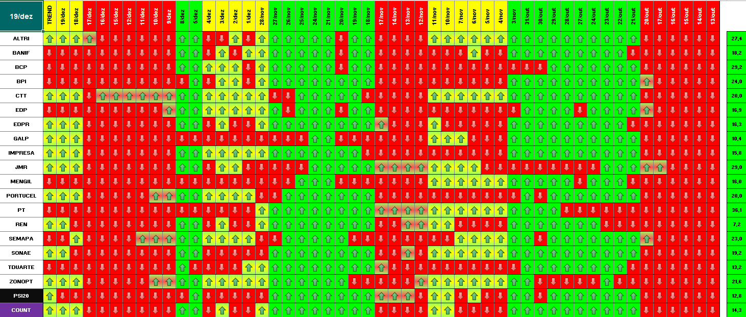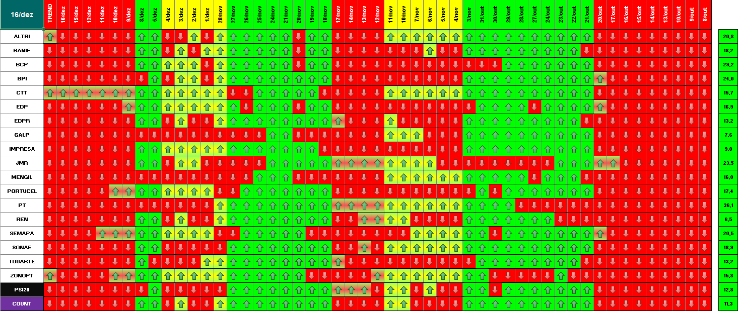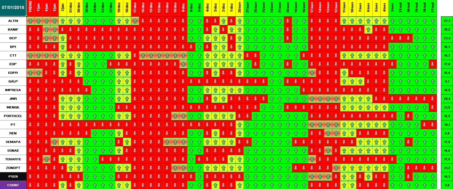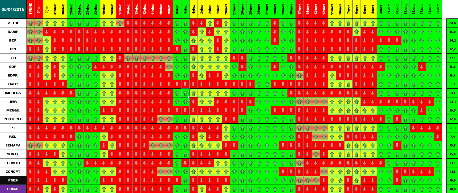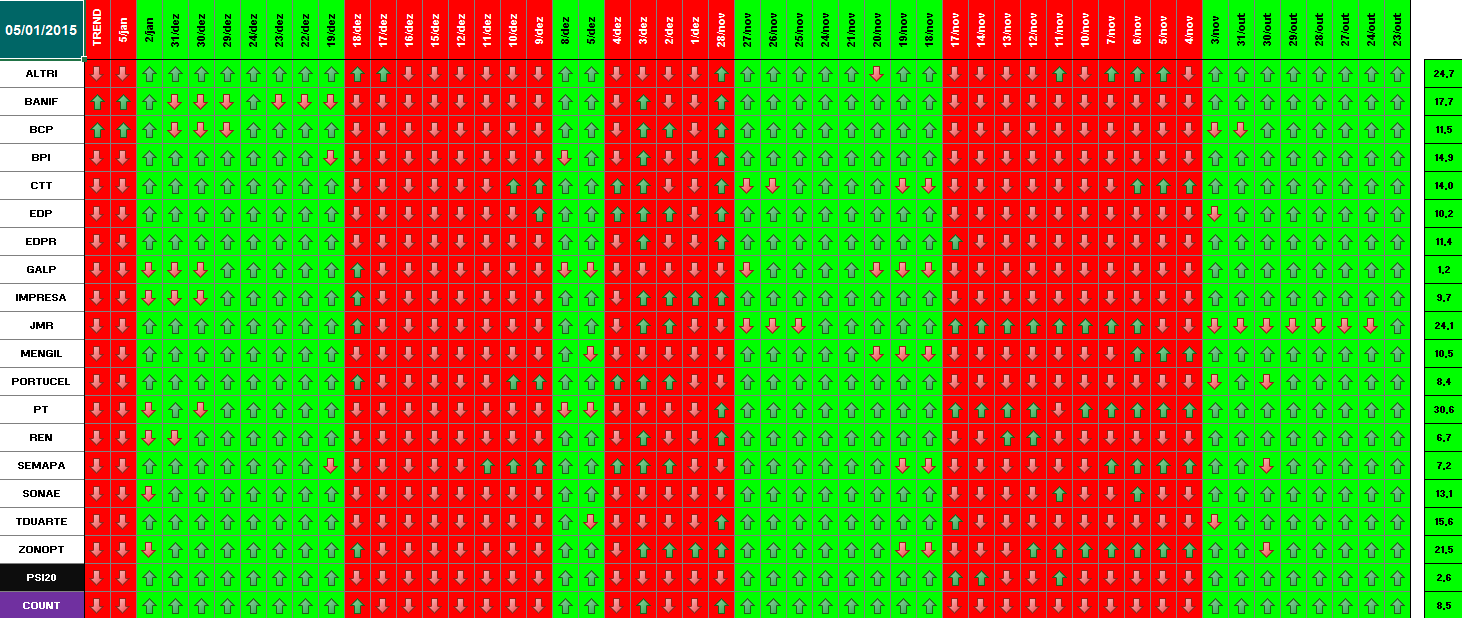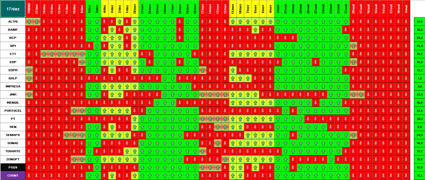 Segue em baixo informação / quadros atualizados com os dados de 18 de Dezembro de 2014. Se amanhã se confirmar este optimismo, o modelo deu sinal de presença no mercado. Hoje já se verificou essa informação para alguns títulos. Dos 18 títulos que compõem o PSI 20, metade (9) já deram sinal de entrada. Quanto ao optimismo de hoje e tendo em conta o sucedido a nível mundial (subida generalizada e com muita força em todas as praças), parece-me inquestionável que os investidores estão confiantes para os próximos dias.