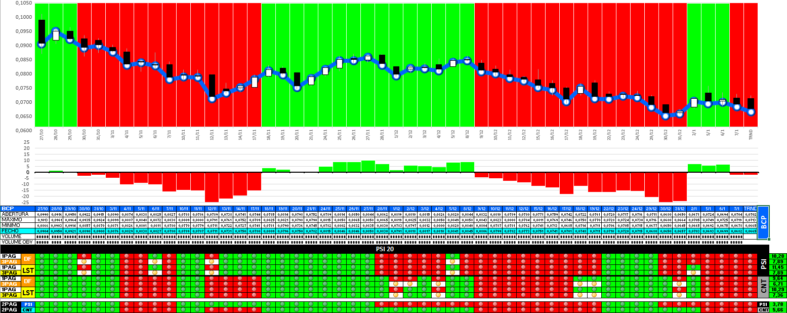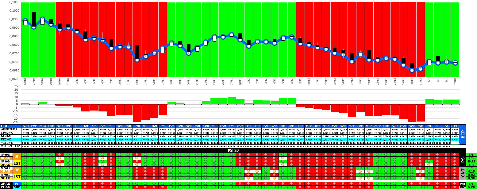 No dia 6 as condições estavam reunidas para dar continuidade à escalada, mas o meio envolvente não ajudou... o PSI 20 perdeu força e no BCP era importante estar atento. Na minha opinião quem não saiu hoje o melhorar é fazê-lo amanhã ASAP (atenção é uma única e simples opinião). A ajudar à festa a PT mergulhou para o abismo... as expetativas para os próximos dias não são nada animadoras...