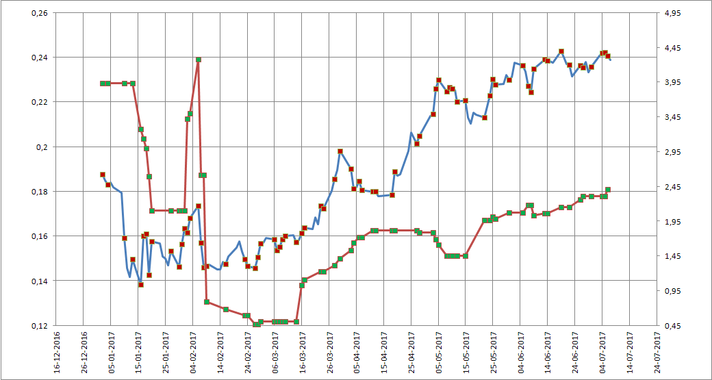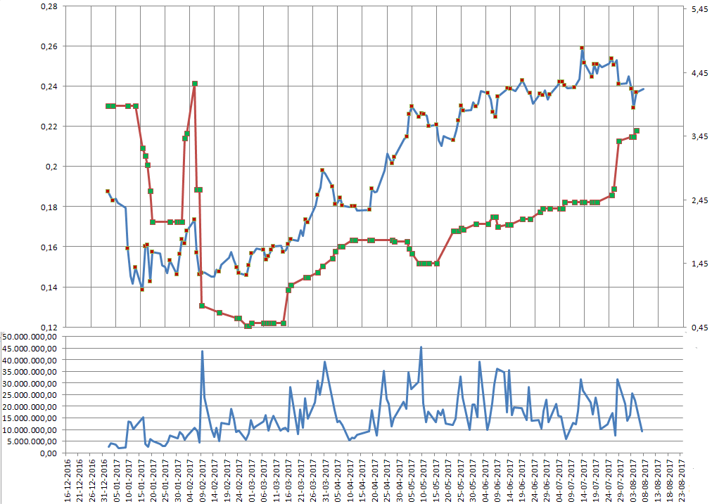 Caro skidline, a linha cor de laranja é o preço, escala da direita.