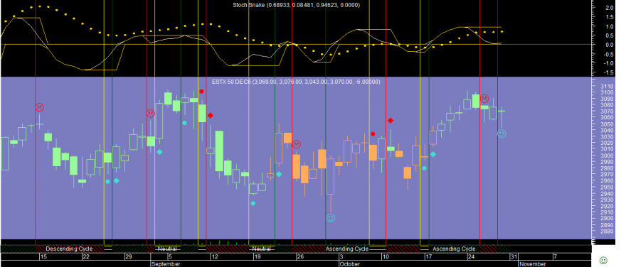A razao incide em ambos os casos no termo do ciclo oscilatório ascendente de curto prazo, como se pode constatar no gráfico abaixo do Euro Stoxx 50.