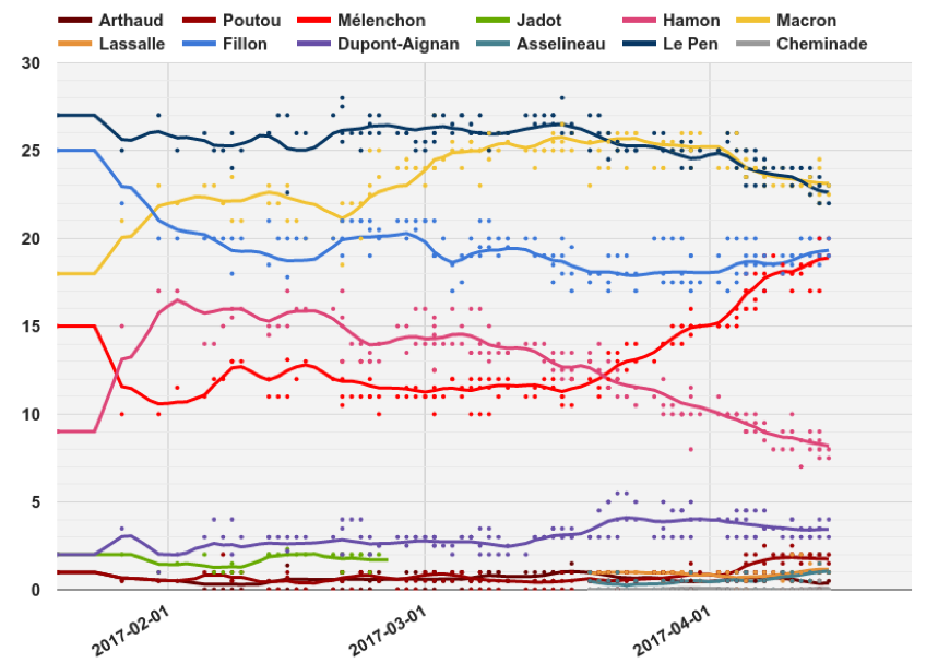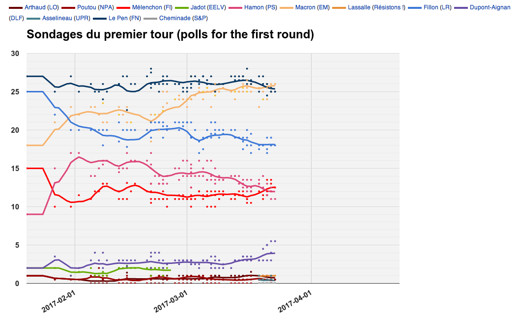 Os estudos de opinião dão conta de que Macron e Le Pen, com cerca de 26%, lideram as intenções de votos dos franceses, seguidos pelo candidato de direita François Fillon, que caiu para cerca de 17% depois do escândalo sobre os empregos fictícios que alegadamente beneficiaram membros da sua família.